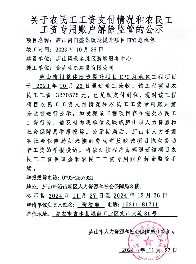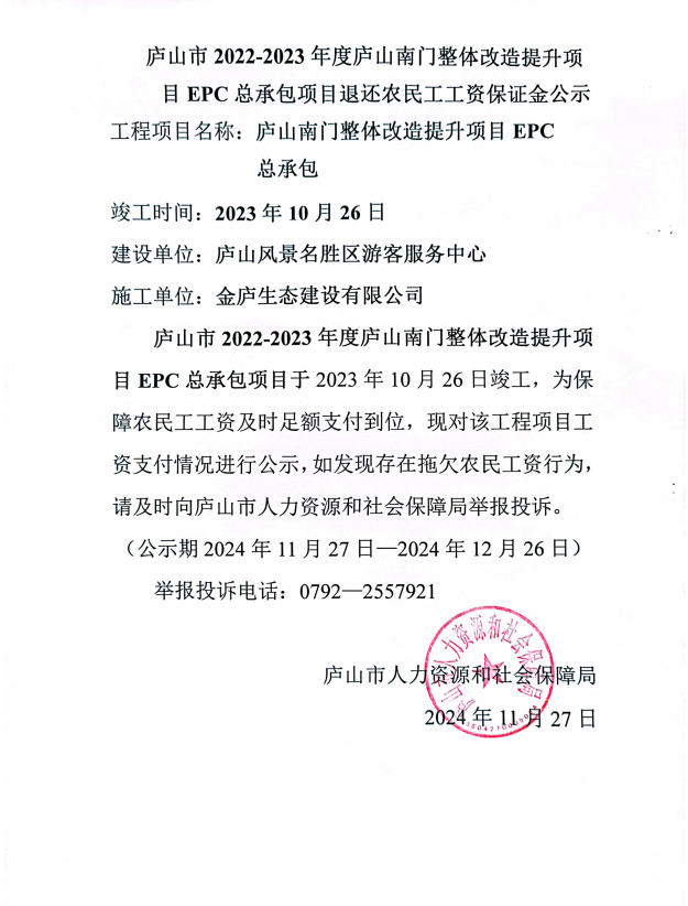 庐山市2022-2023年度庐山南门整体改造提升项目EPC总承包项目退还农民工工资保证金及注销农民工工资专用账户公示