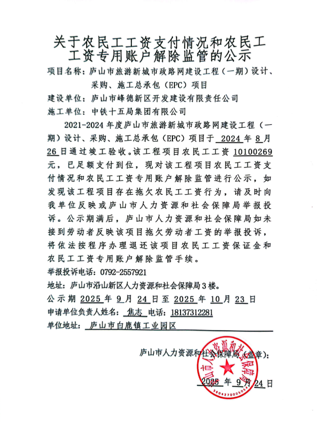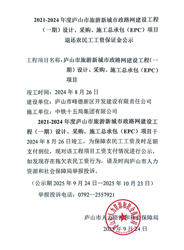 2021-2024年度庐山市旅游新城市政路网建设工程(一期)设计、采购、施工总承包(EPC)项目退还农民工工资保证金及注销农民工工资专用账户公示