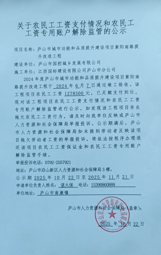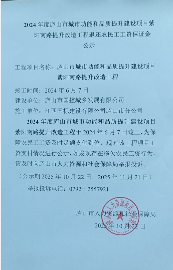2024年度庐山市城市功能和品质提升建设项目紫阳南路提升改造工程退还农民工工资保证金及注销农民工工资专用账户公示