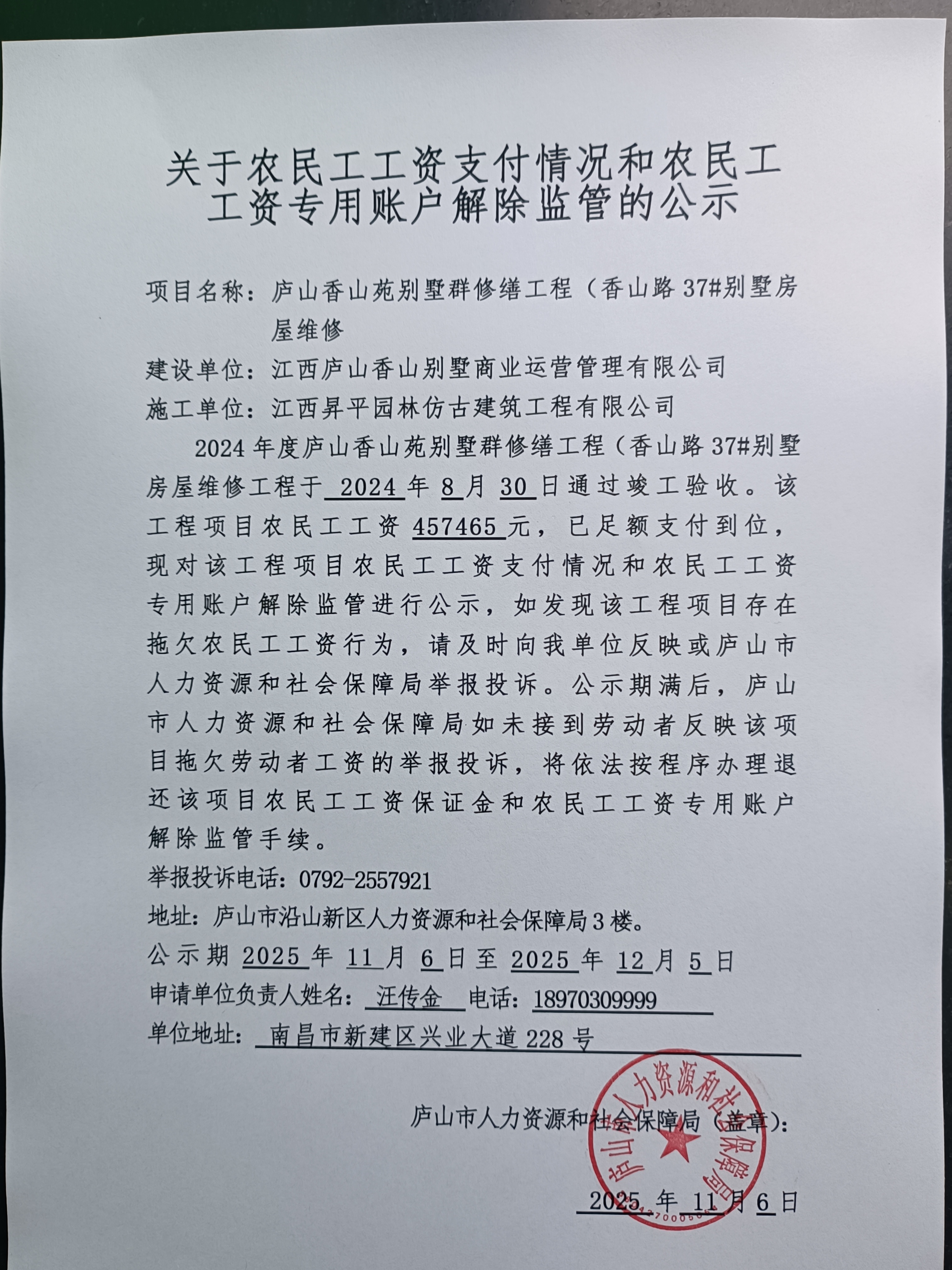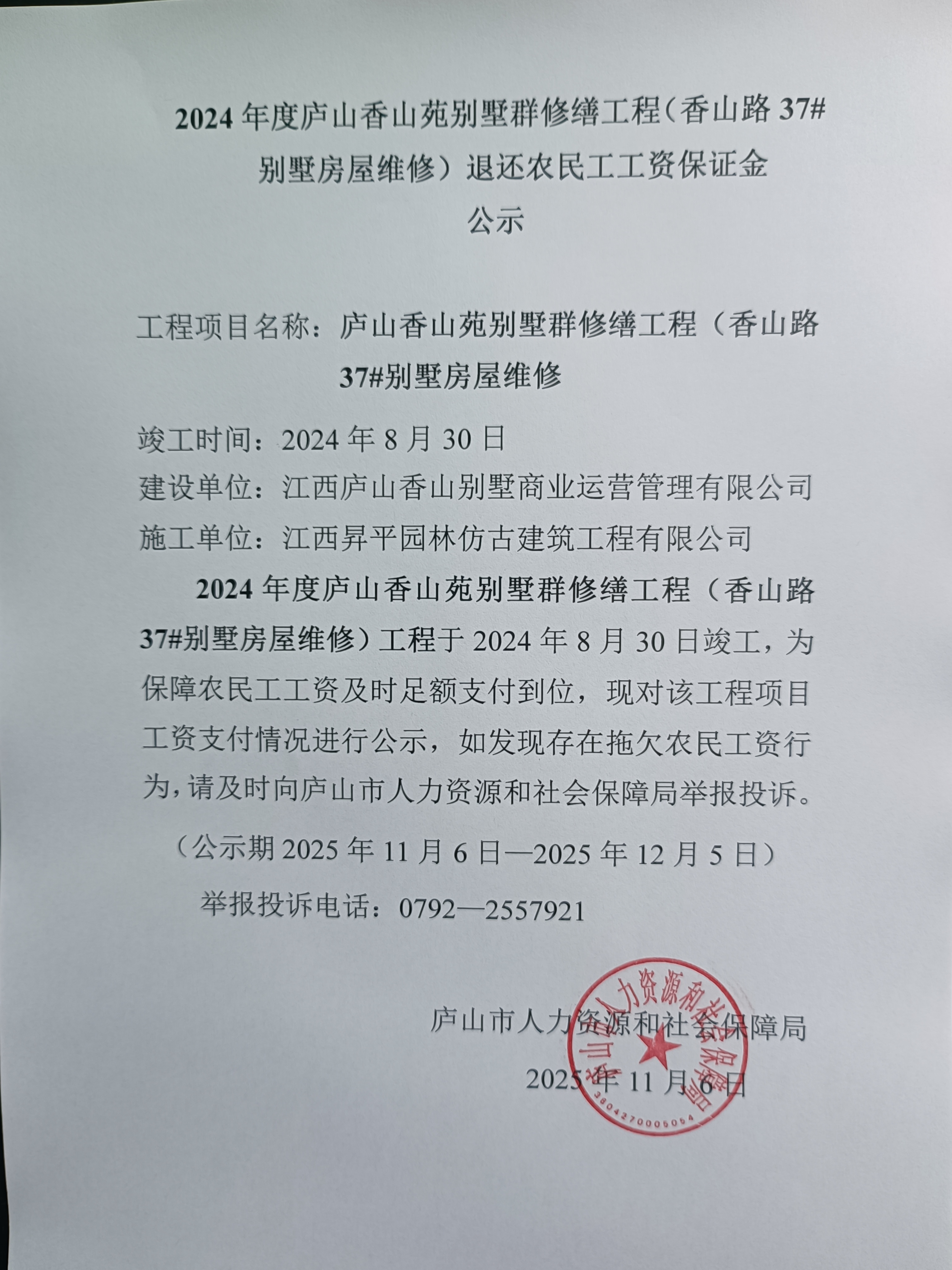 2024年度庐山香山苑别墅群修缮工程(香山路37#别墅房屋维修)退还农民工工资保证金和注销农民工工资专用账户公示