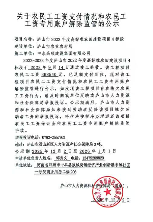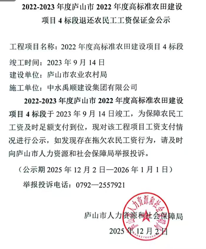 2022-2023年度庐山市2022年度高标准农田建设项目4标段退还农民工工资保证金及注销农民工工资专用账户公示