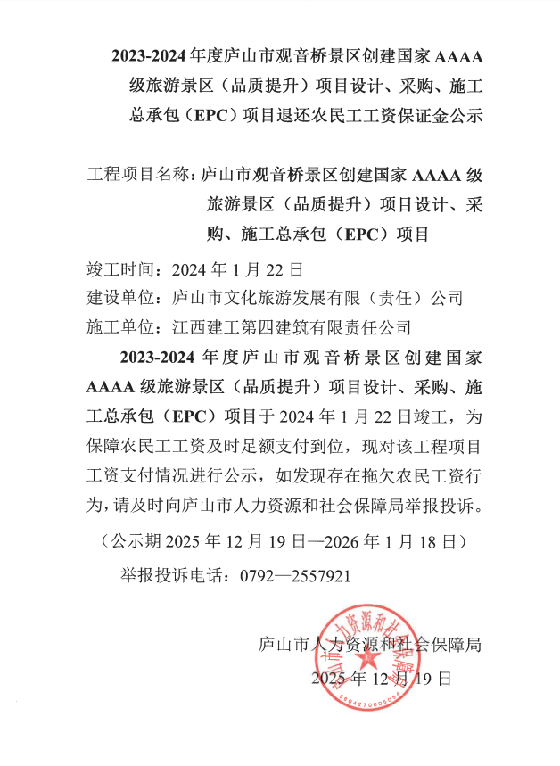 2023-2024年度庐山市观音桥景区创建国家AAAA级旅游景区(品质提升)项目设计、采购、施工总承包(EPC)项目退还农民工工资保证金及注销农民工工资专用账户公示