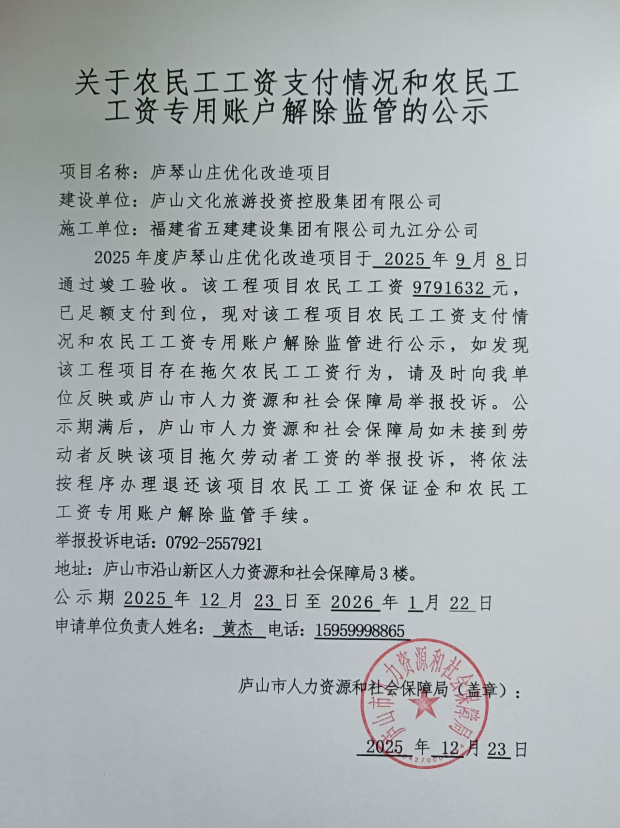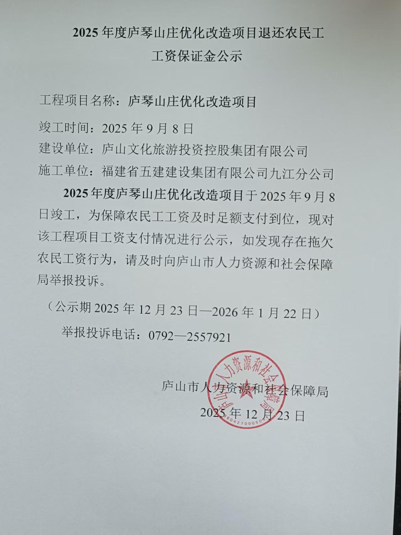 2025年度庐琴山庄优化改造项目退还农民工 工资保证金及注销农民工工资专用账户公示
