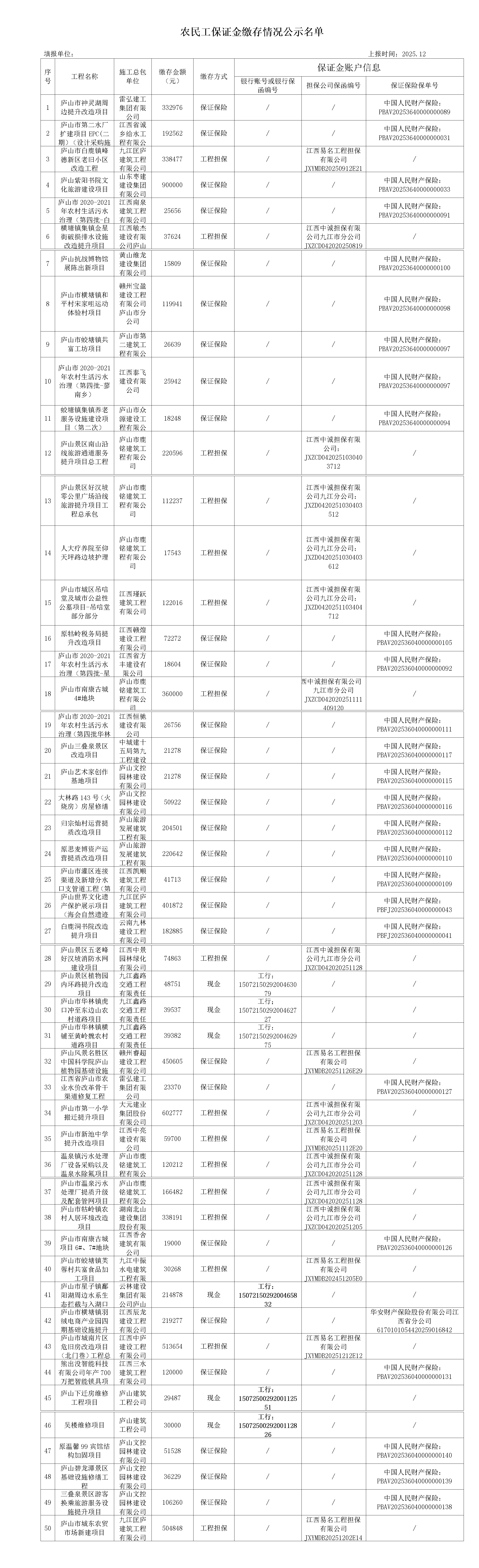 农民工保证金缴存情况公示名单
