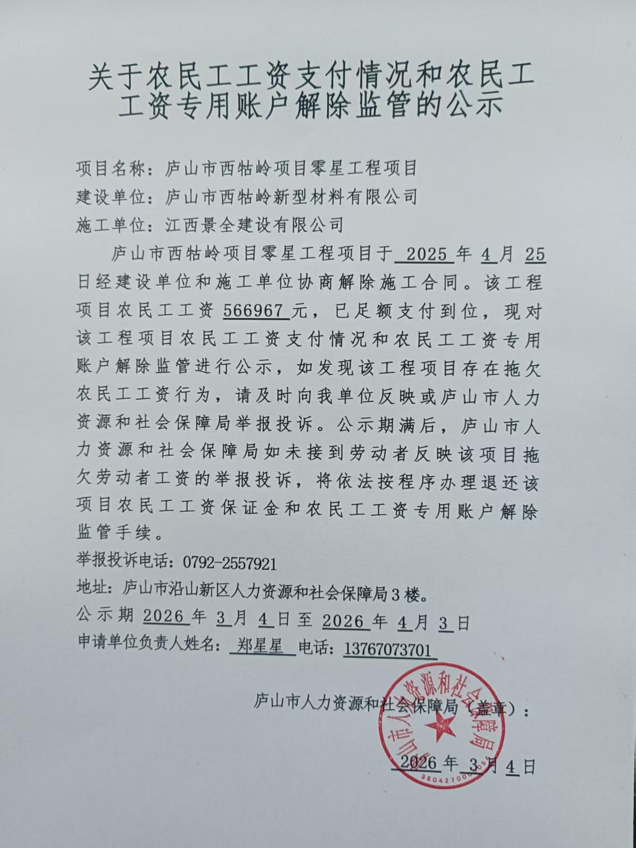 庐山市西牯岭项目零星工程项目注销农民工工资专用账户公示
