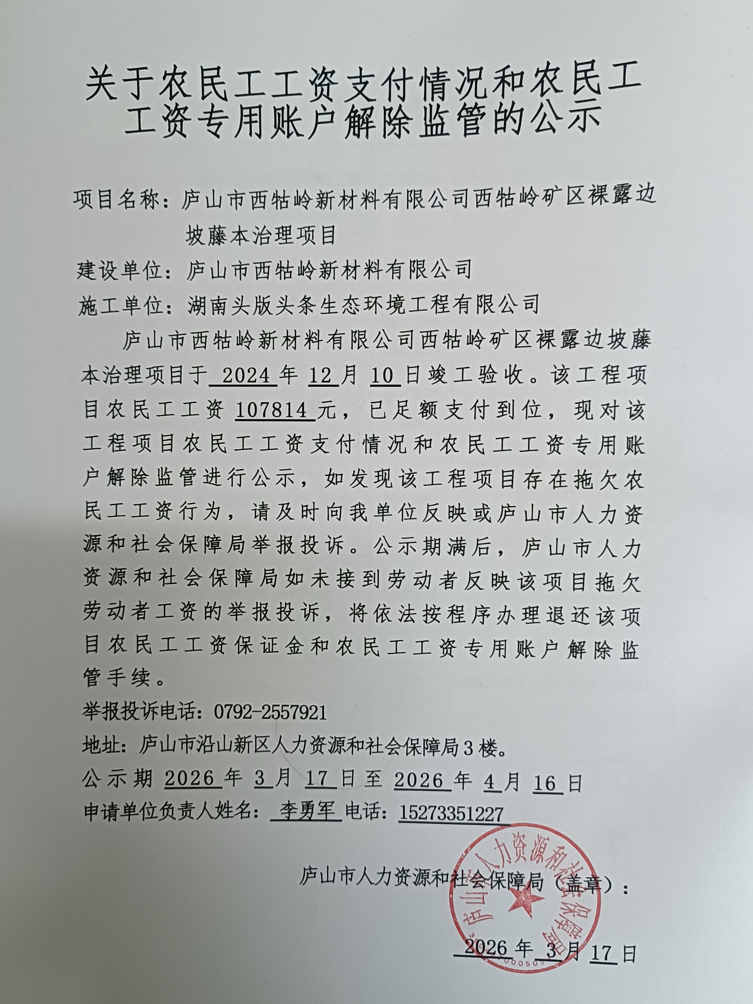 庐山市西牯岭新材料有限公司西牯岭矿区裸露边坡藤本治理项目注销农民工工资专用账户公示