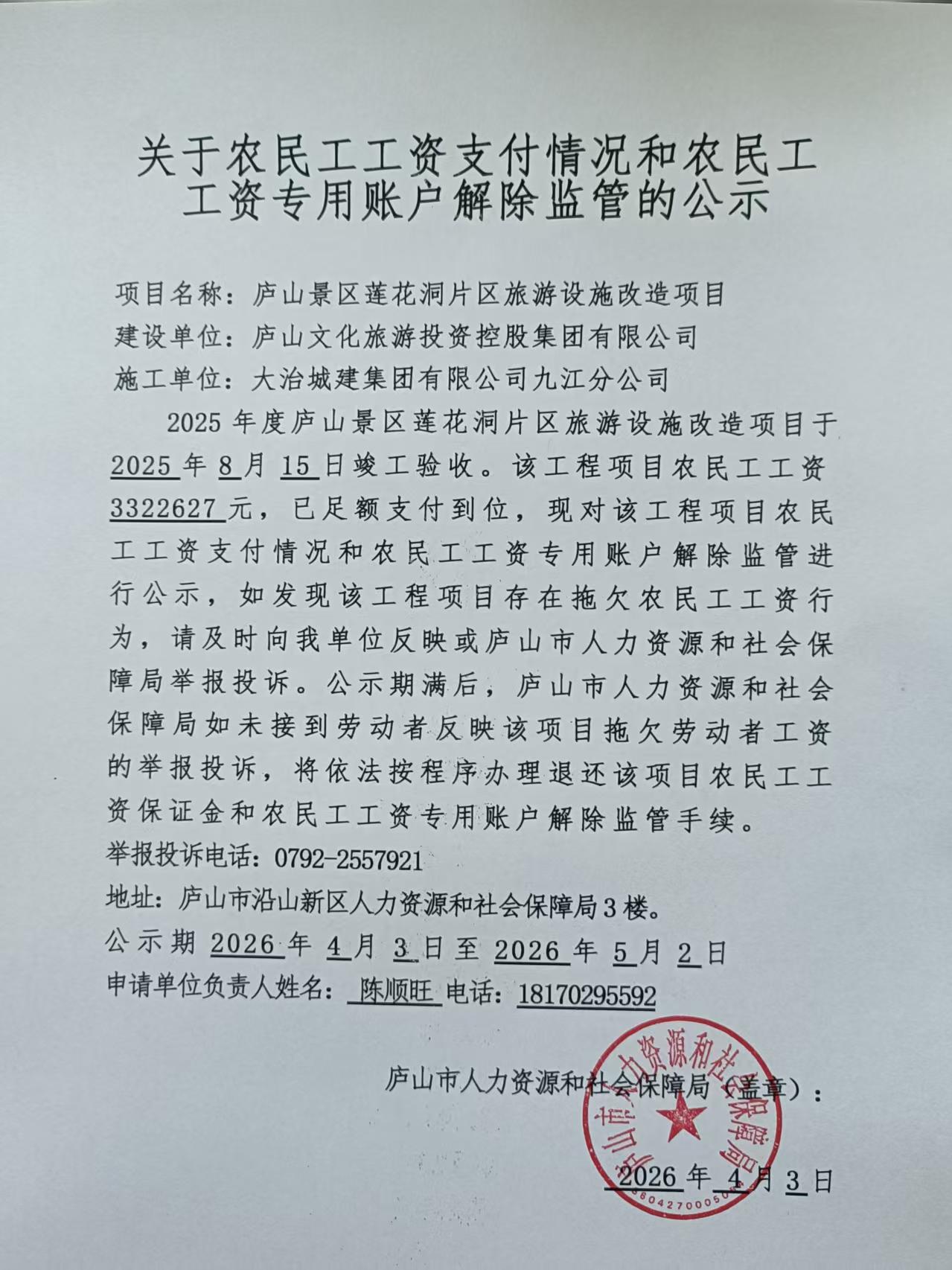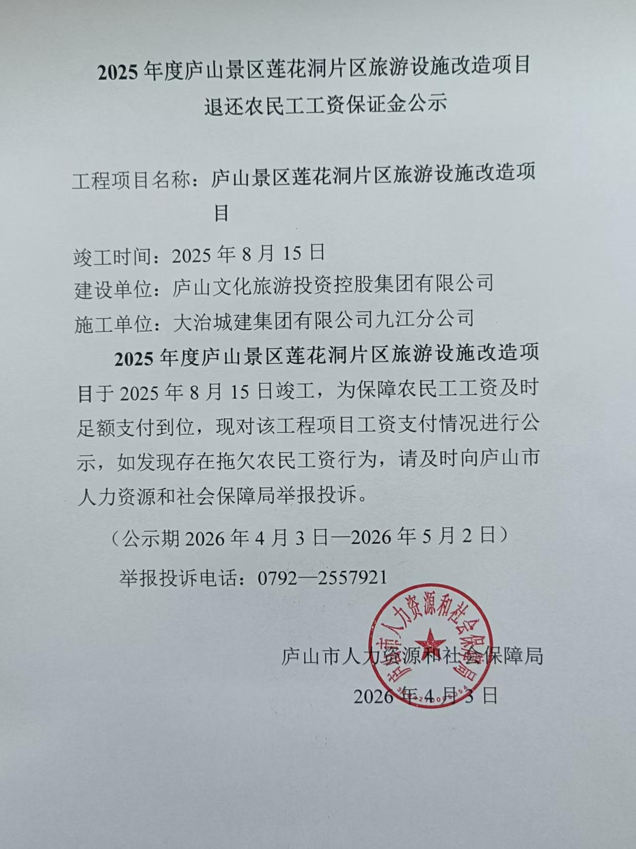 2025年度庐山景区莲花洞片区旅游设施改造项目退还农民工工资保证金及注销农民工工资专用账户公示