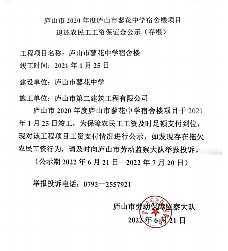 庐山市2020年度庐山市蓼花中学宿舍楼项目退还农民工工资保证金公示