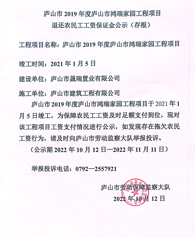 庐山市2019年度庐山市鸿瑞家园工程项目退还农民工工资保证金公示