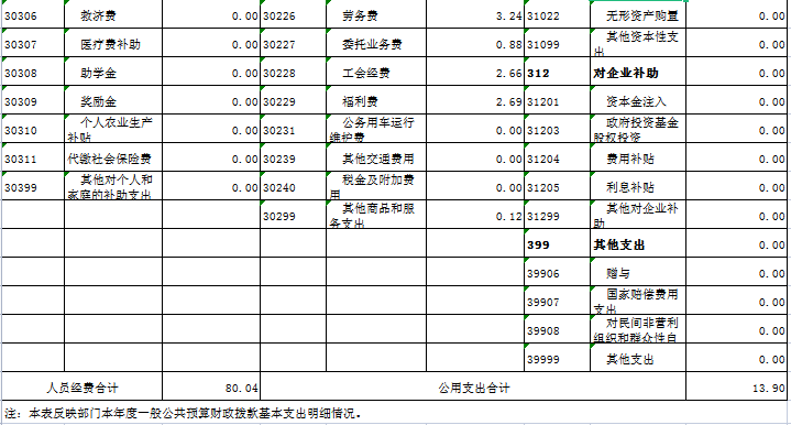 本部门2020年度支出总计93.94万元,其中本年支出合计93.94万元,较2019年减少15.08万元,减少13.83%,主要原因:上年有办公设备购置,今年无;年末结转和结余1.42万元,较2019年减少12.26万元,下降8.96%,主要原因为本年支出增加。