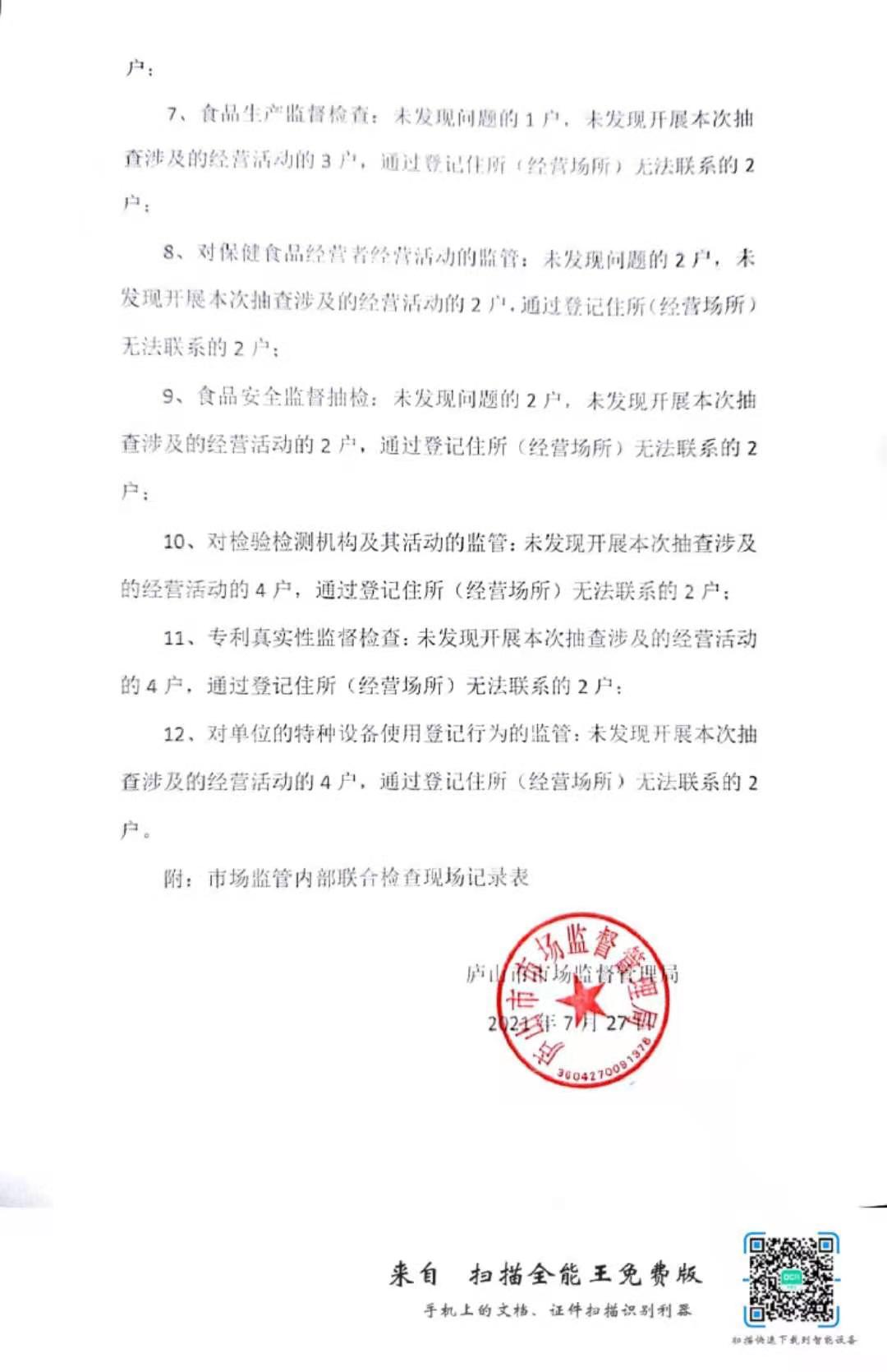 庐山市市场监管局2021年度内部联合双随机检查工作汇报