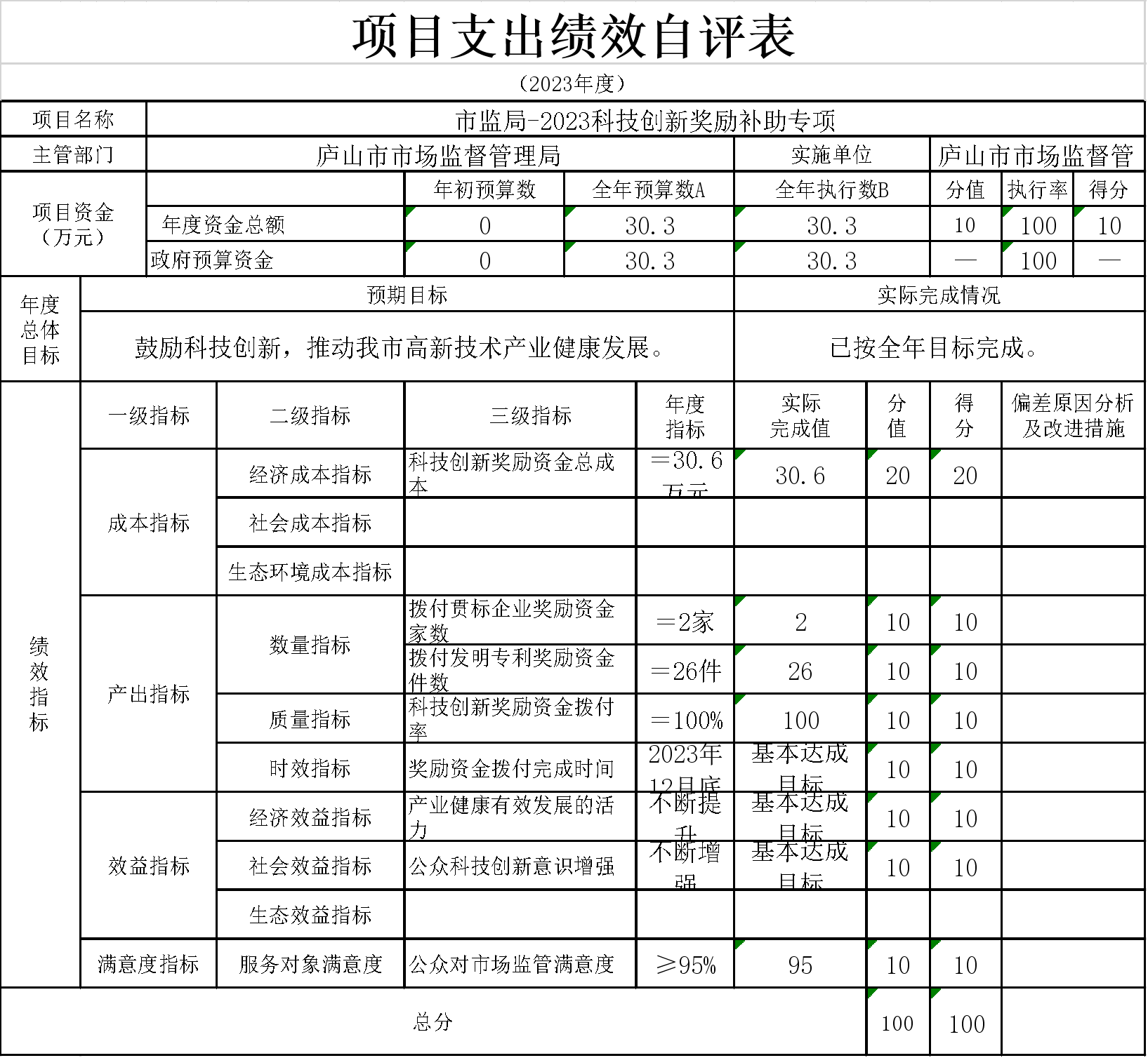 1、本单位“市监局-2023科技创新奖励补助专项”项目支出绩效自评表”如下: