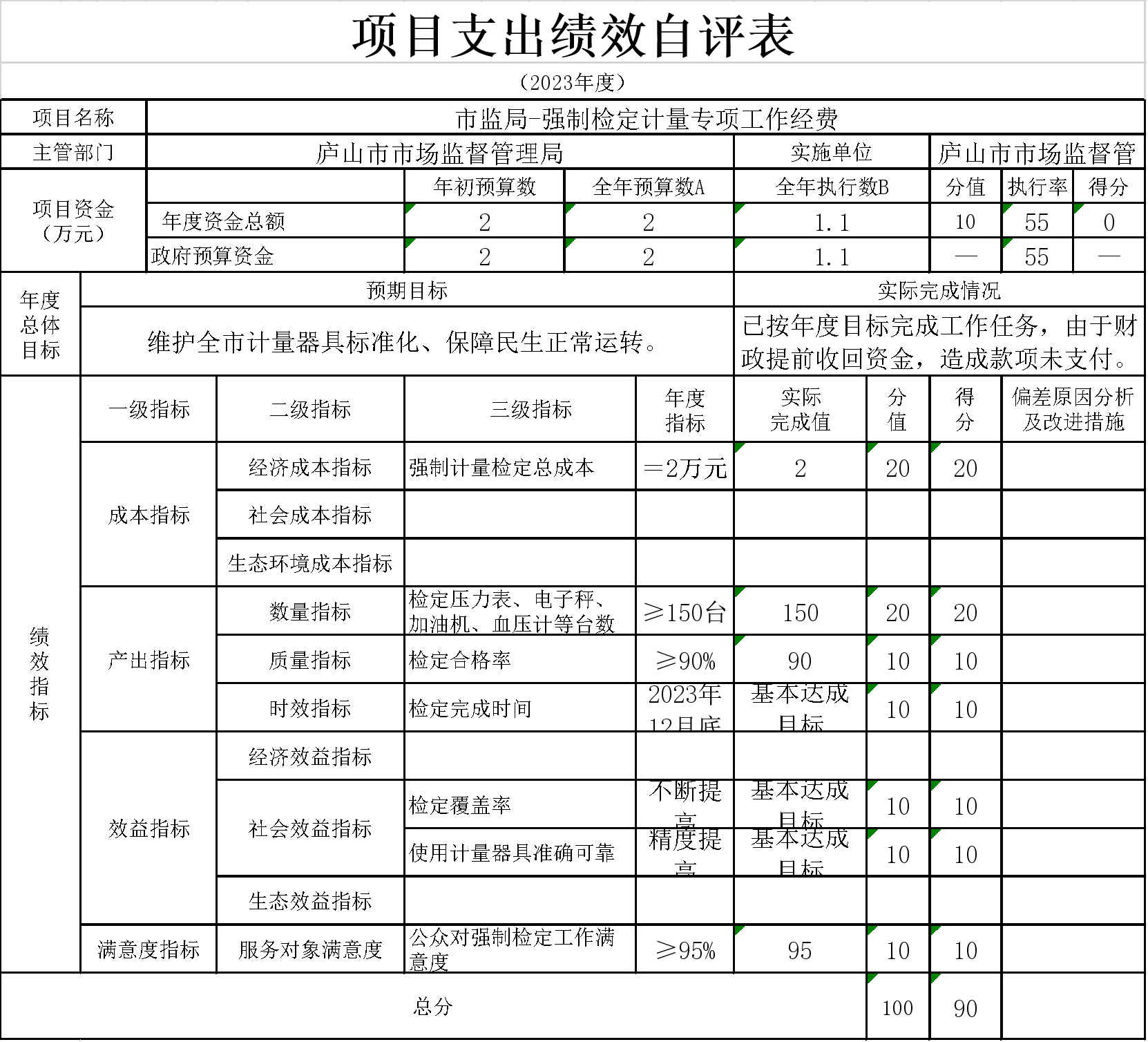 2、本单位“市监局-强制检定计量专项工作经费”项目支出绩效自评表”如下: