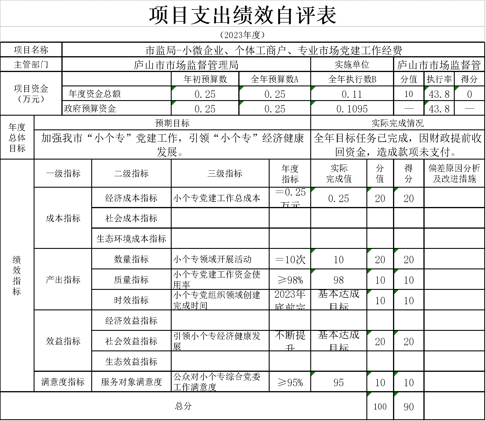 3、本单位“市监局-小微企业、个体工商户、专业市场党建工作经费”项目支出绩效自评表”如下: