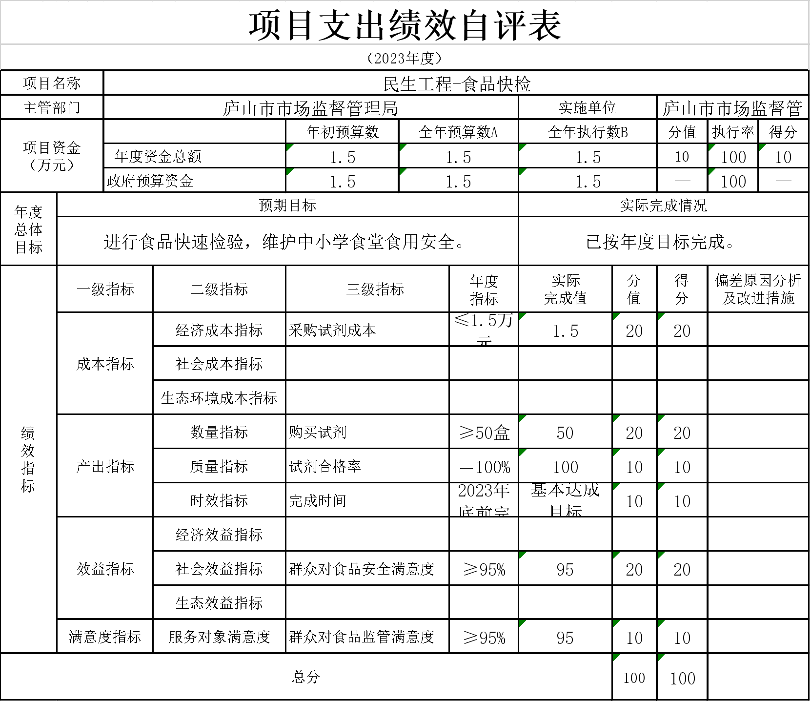6、本单位“民生工程-食品快检”项目支出绩效自评表”如下: