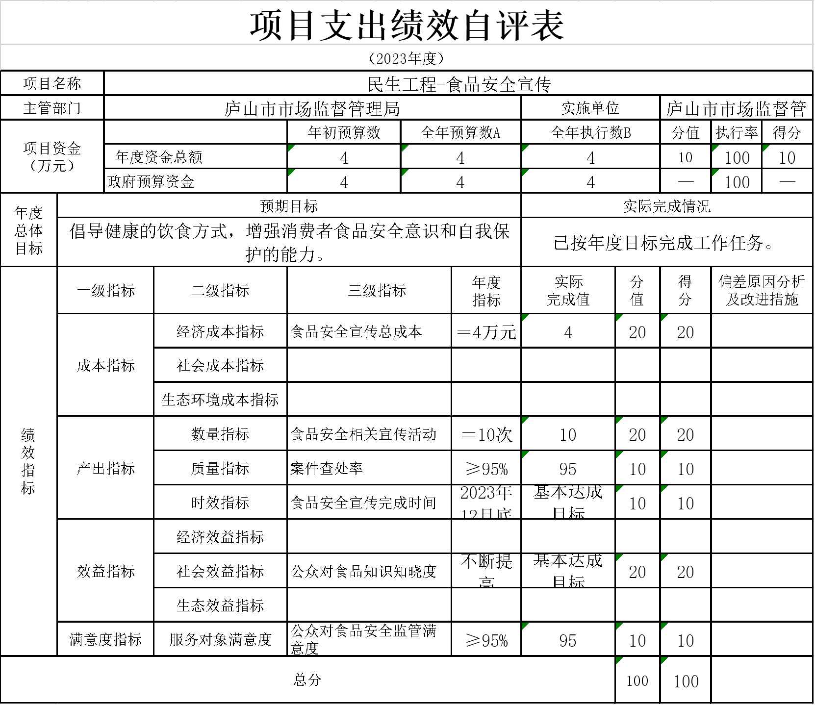 7、本单位“民生工程-食品安全宣传”项目支出绩效自评表”如下: