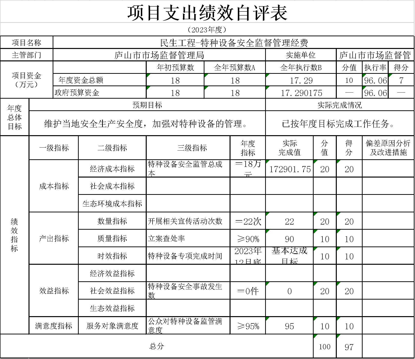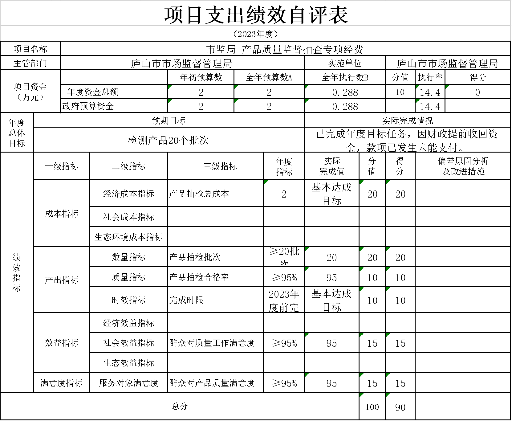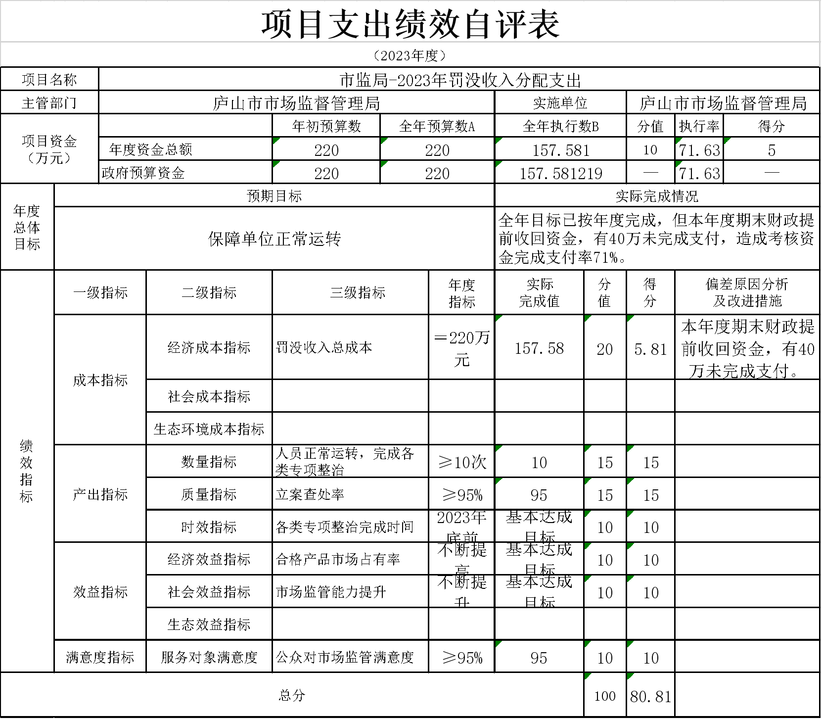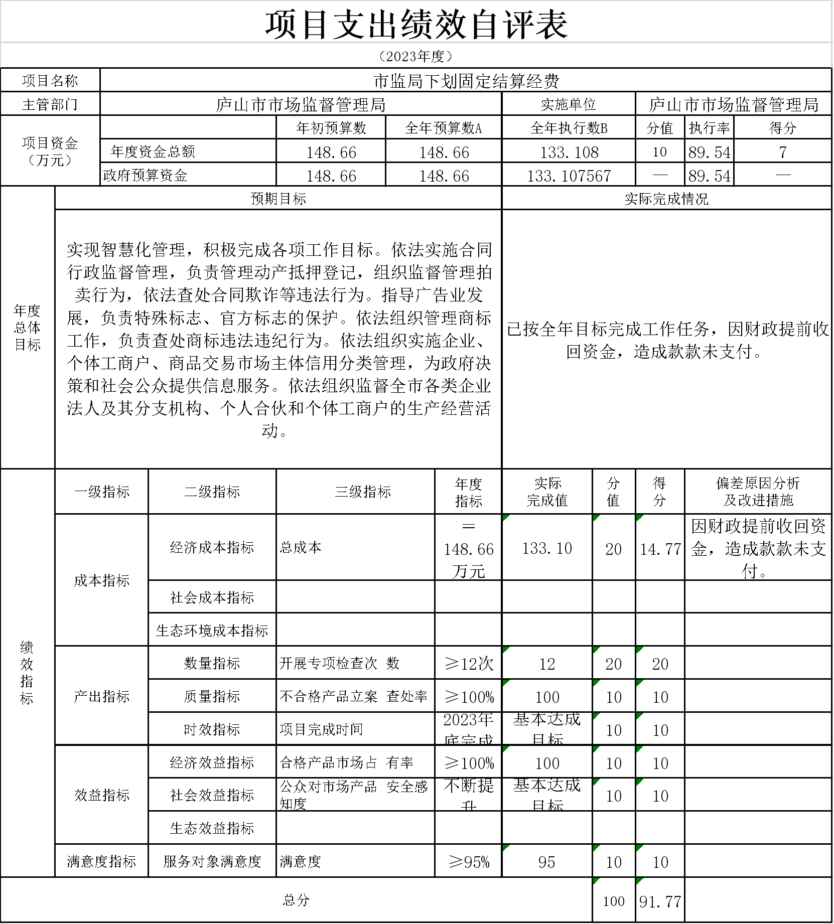 14、本单位“市监局下划固定结算经费”项目支出绩效自评表”如下: