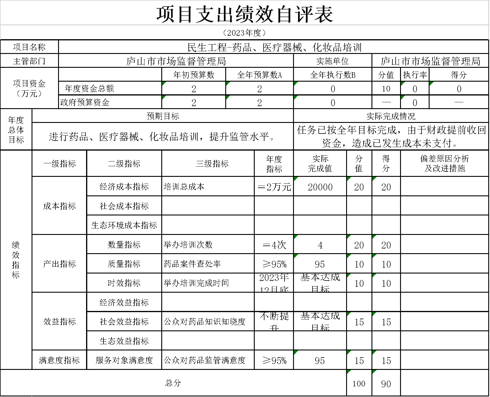 9、本单位“民生工程-药品、医疗器械、化妆品培训”项目支出绩效自评表”如下: