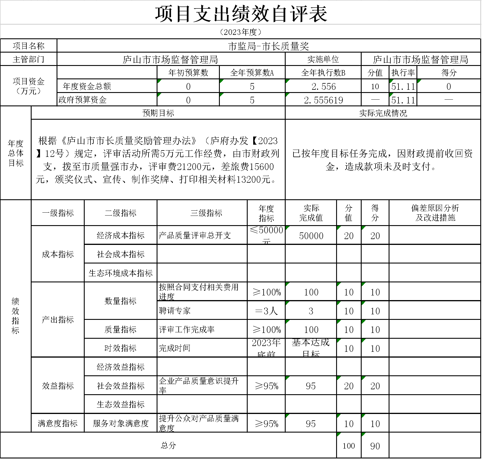 11、本单位“市监局-市长质量奖2023”项目支出绩效自评表”如下: