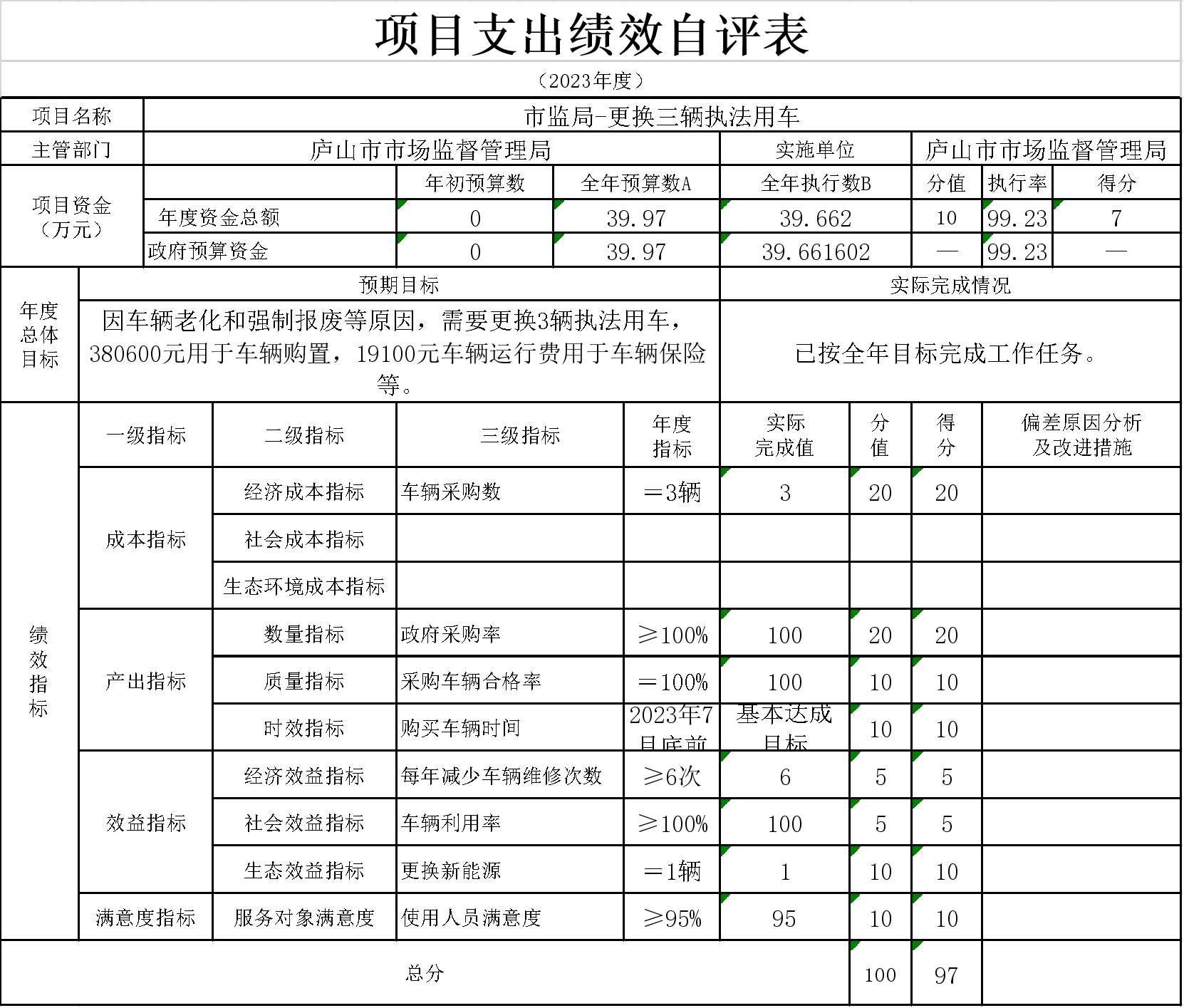 12、本单位“市监局-更换三辆执法用车”项目支出绩效自评表”如下: