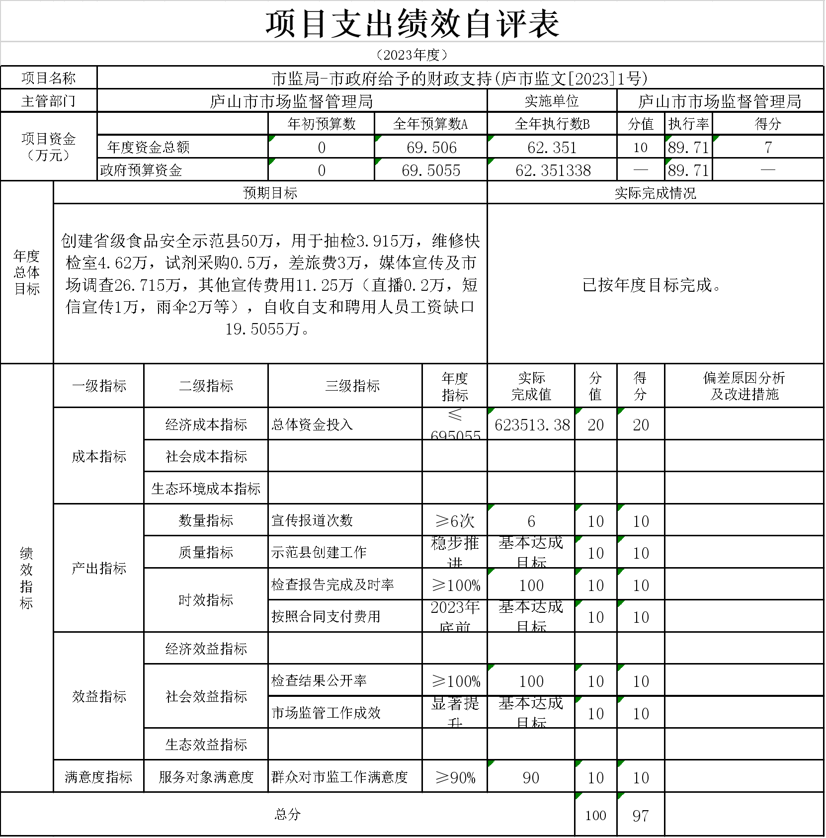 15、本单位“市监局-市政府给予的财政支持(庐市监文[2023]1号)”项目支出绩效自评表”如下: