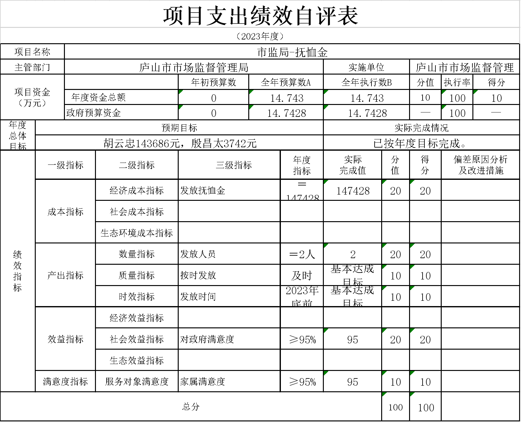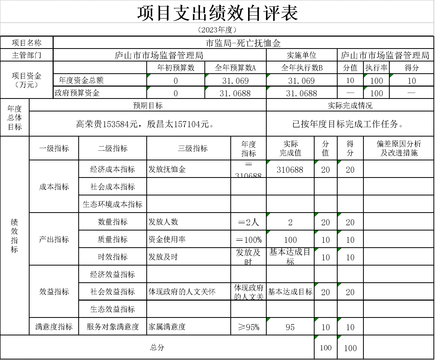 18、本单位“市监局-死亡抚恤金”项目支出绩效自评表”如下:
