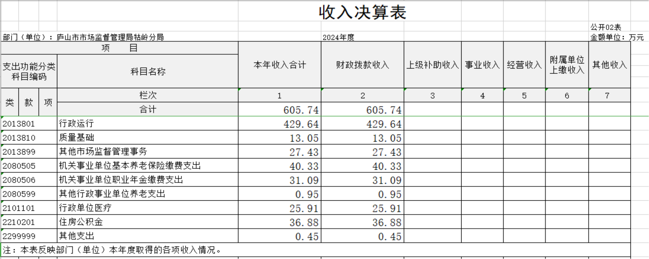 本年收入的具体构成:财政拨款收入605.74万元,占100%;事业收入0.00万元,占0.00%;经营收入0.00万元,占0.00%;上级补助收入0.00万元,占0.00%;附属单位上缴收入0.00万元,占0.00%;其他收入0万元,占0.00%。