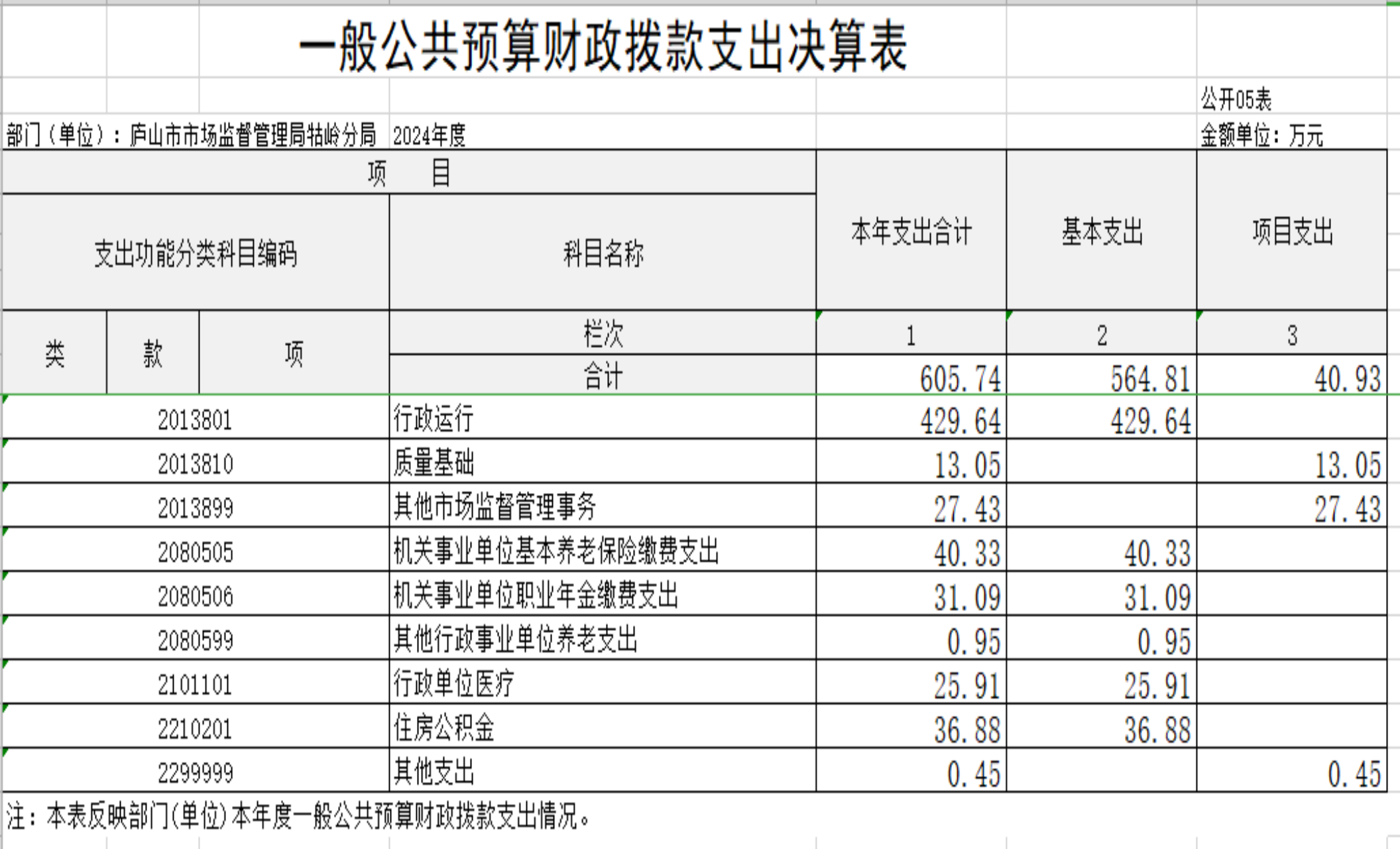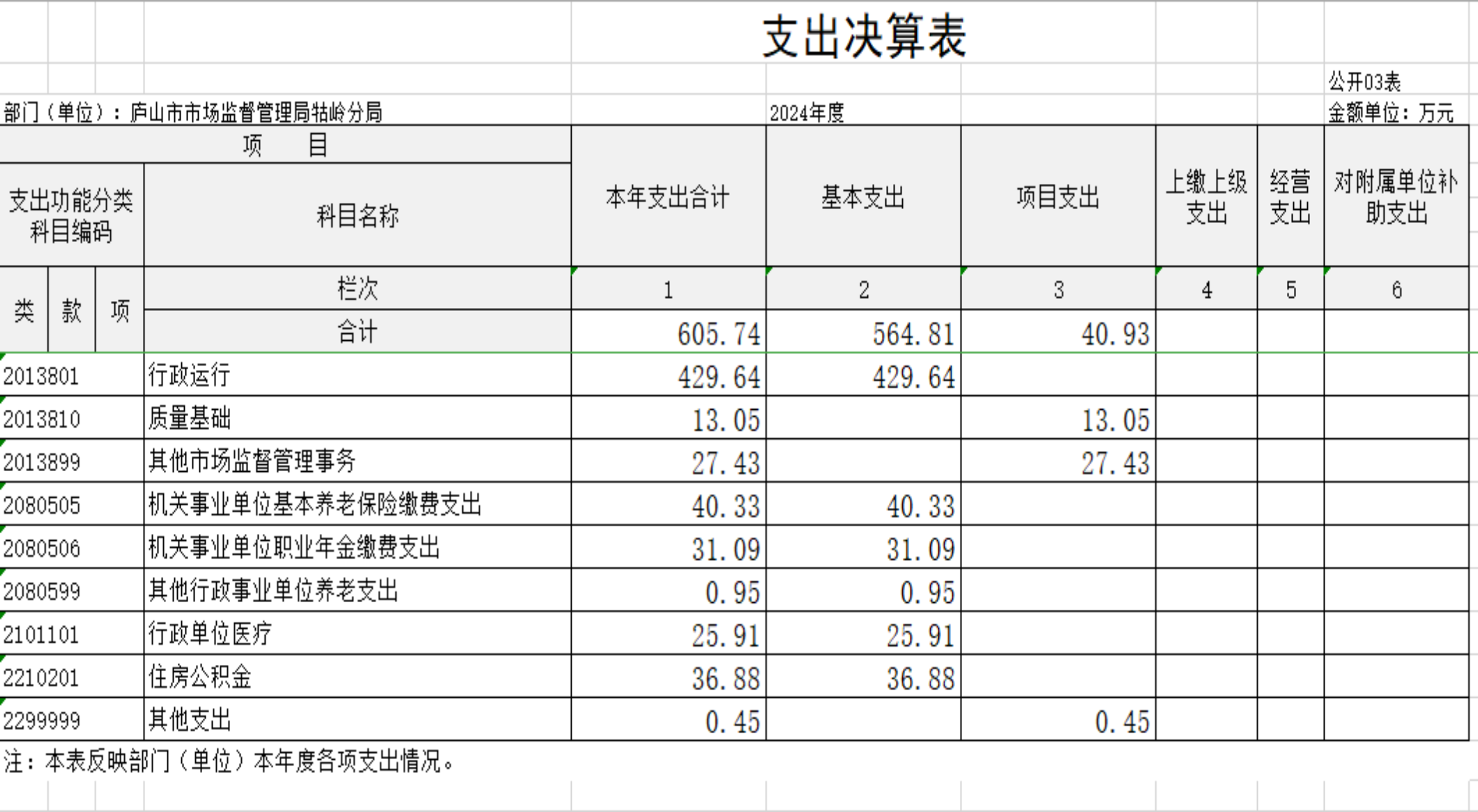 本年支出的具体构成:基本支出564.81万元,占93.24%;项目支出40.93万元,占6.76%;经营支出0.00万元,占0.00%;上缴上级支出0.00万元,占0.00%;对附属单位补助支出0.00万元,占0.00%。