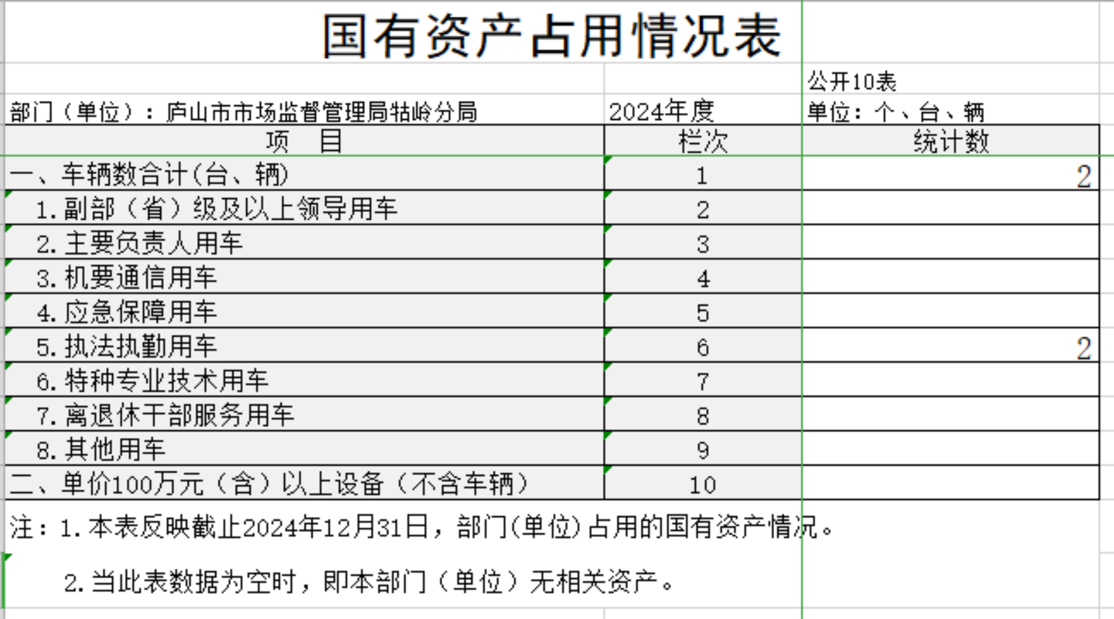 截止2024年12月31日,本单位共有车辆2辆(台),其中:副部(省)级及以上领导用车0辆、主要负责人用车0辆、机要通信用车0辆、应急保障用车0辆、执法执勤用车2辆、特种专业技术用车0辆、离退休干部服务用车0辆、其他用车0辆。本单位单价100万元(含)以上设备(不含车辆)0台(套)。