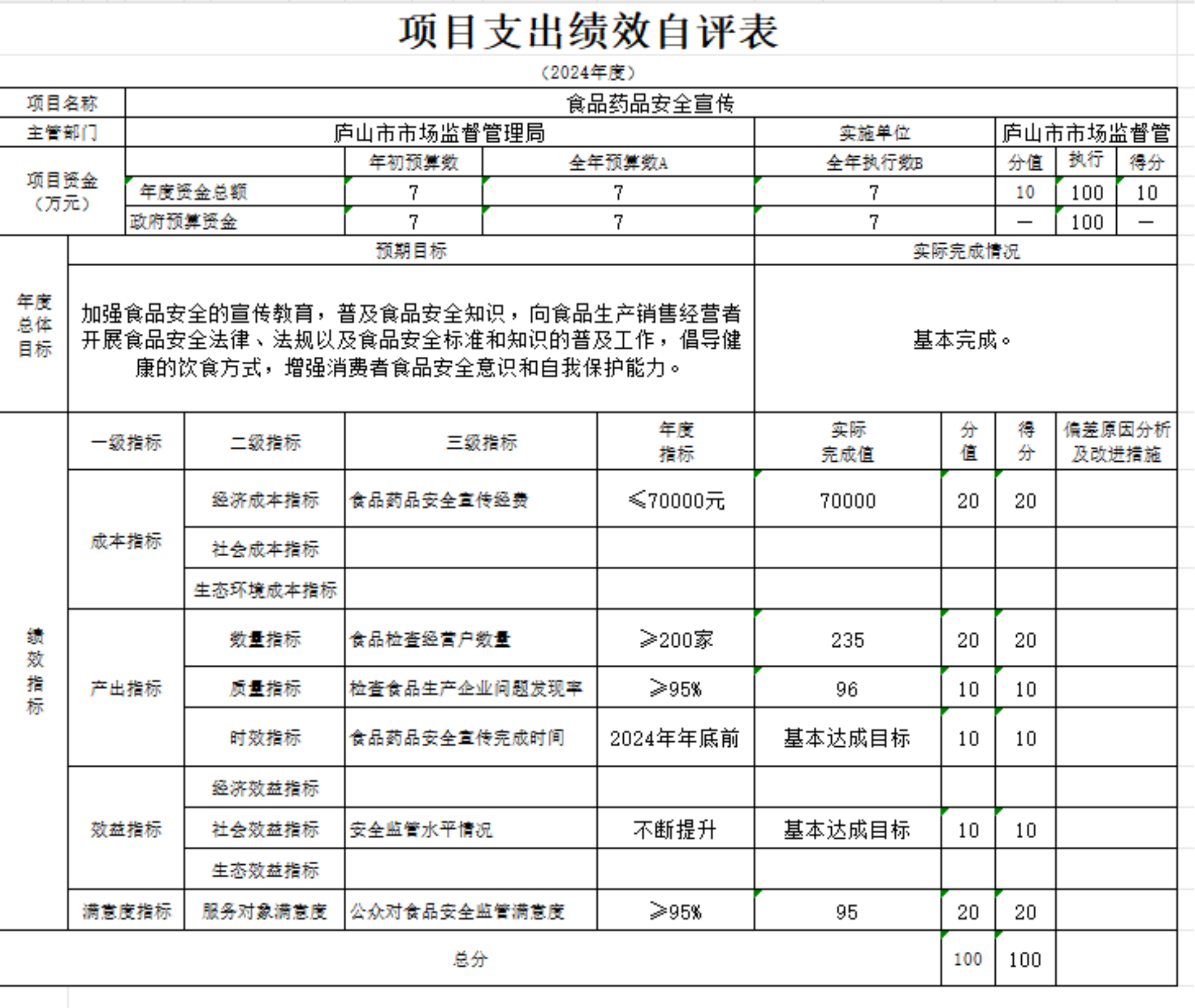 1、本单位“食品药品安全宣传项目支出绩效自评表”如下: