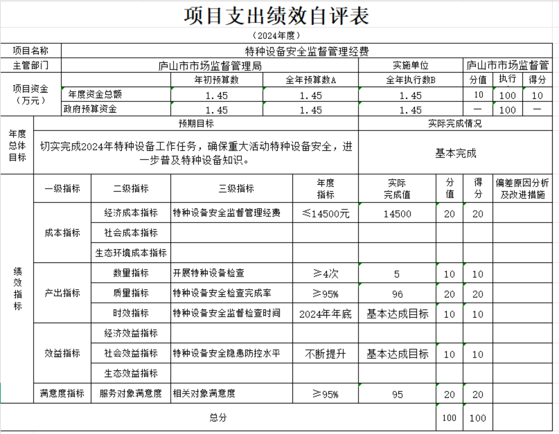 2、本单位“特种设备安全监督管理经费项目支出绩效自评表”如下: