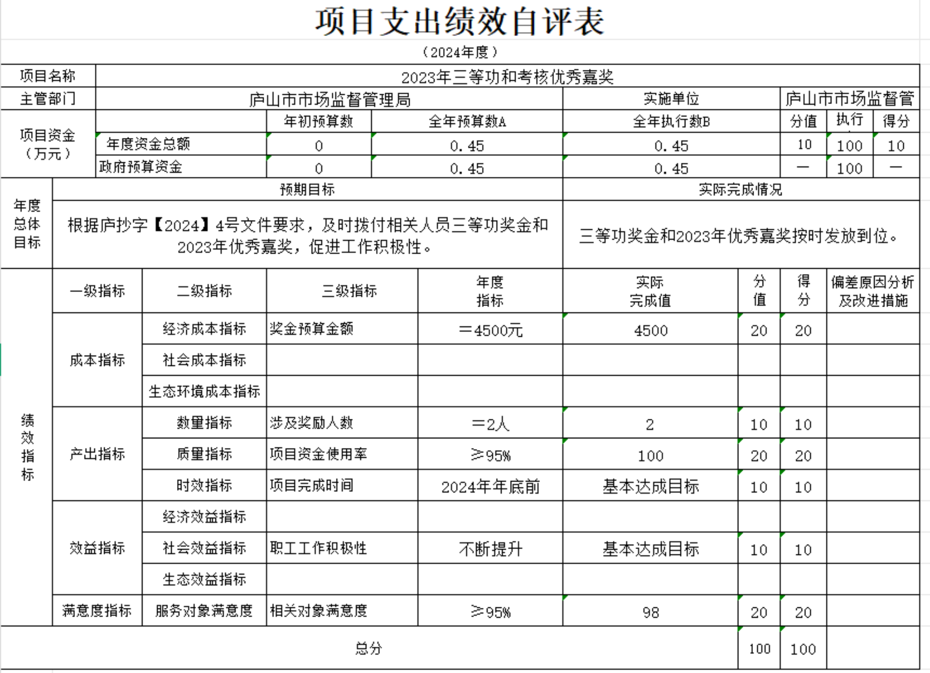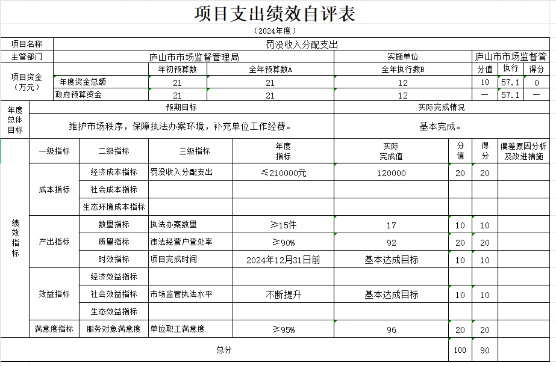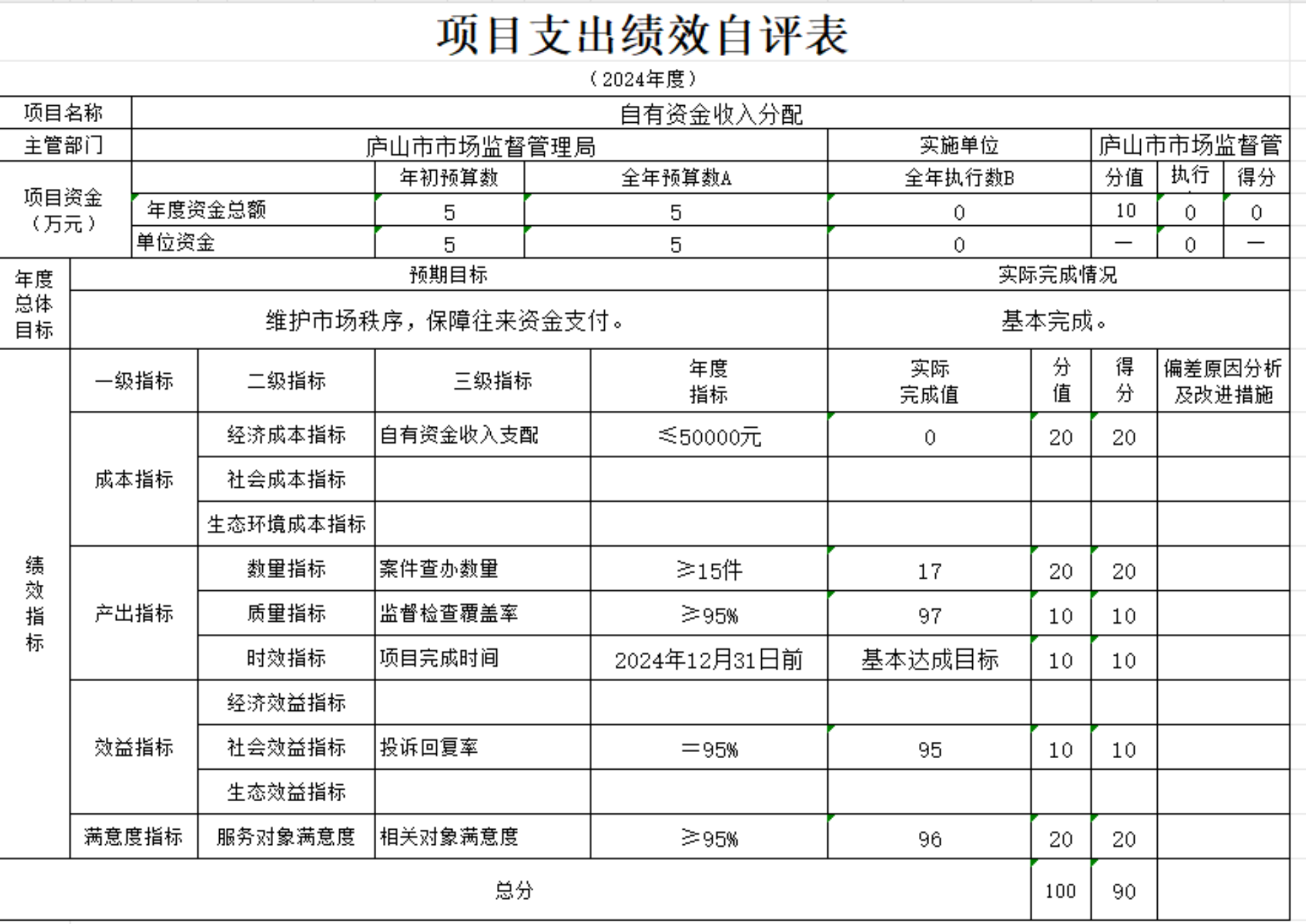 6、本单位“庐山市市场监督管理局牯岭分局-自有资金收入分配项目支出绩效自评表”如下: