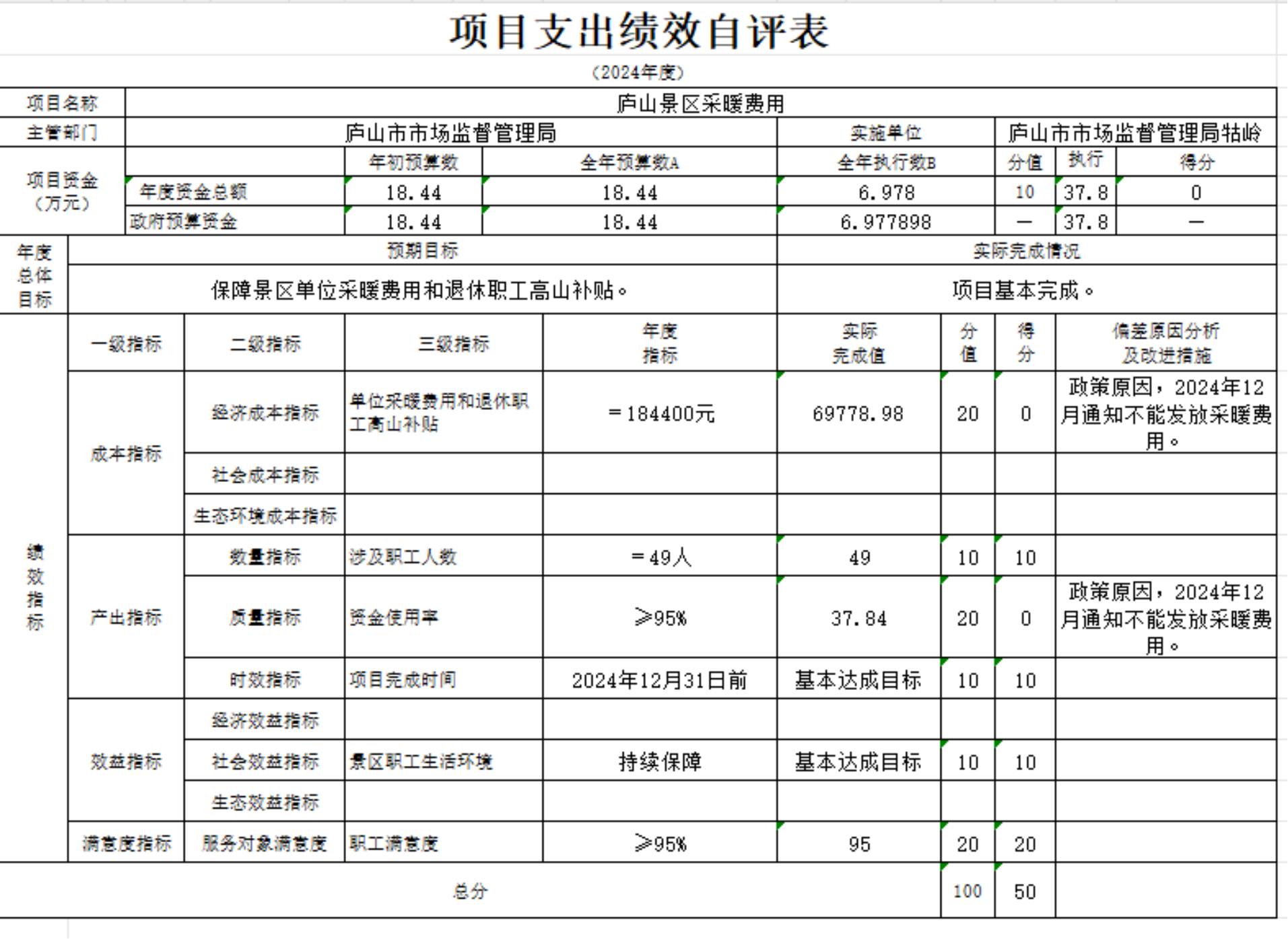 4、本单位“庐山景区采暖费用项目支出绩效自评表”如下: