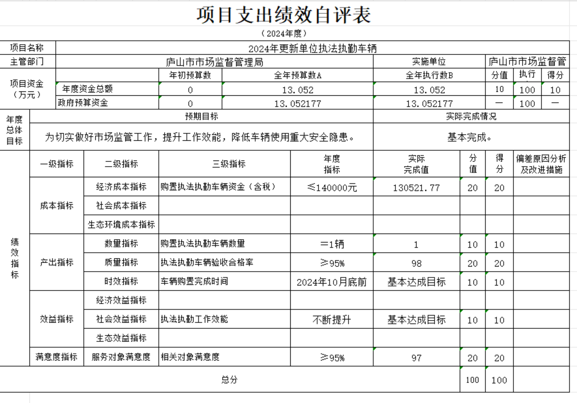 7、本单位“2024年更新单位执法执勤车辆项目支出绩效自评表”如下: