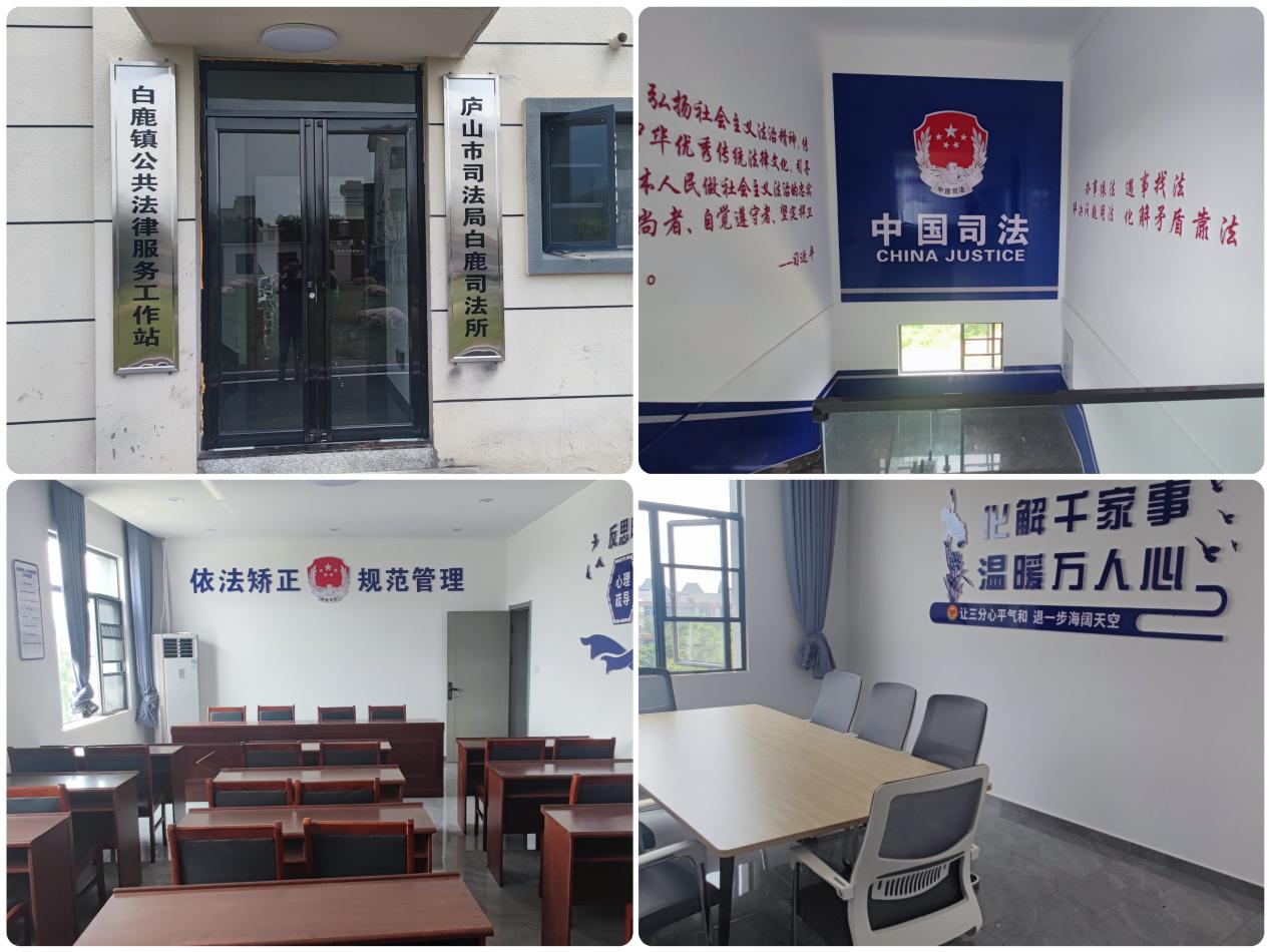 庐山市司法局、白鹿镇高度重视司法所建设工作,严格按照基层司法所规范化建设标准和要求进行打造,白鹿镇政府腾让出新建的便民服务中心大楼三楼的五间办公室,作为白鹿司法所办公场所,庐山市司法局投入资金8万元进行装修建设。2023年8月正式建设完成投入使用。