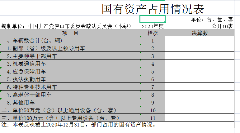 (二) 国有资产占用情况说明。截至2020年12月31日,本部门共有车辆0辆,其中:领导干部用车0辆、一般公务用车0辆、一般执法执勤用车0辆、特种专业技术用车0辆、其他用车0辆,无车辆。