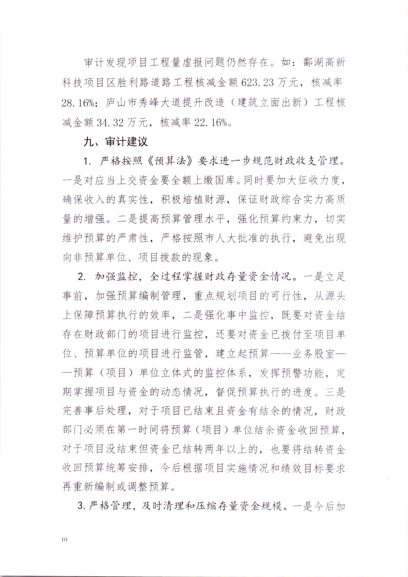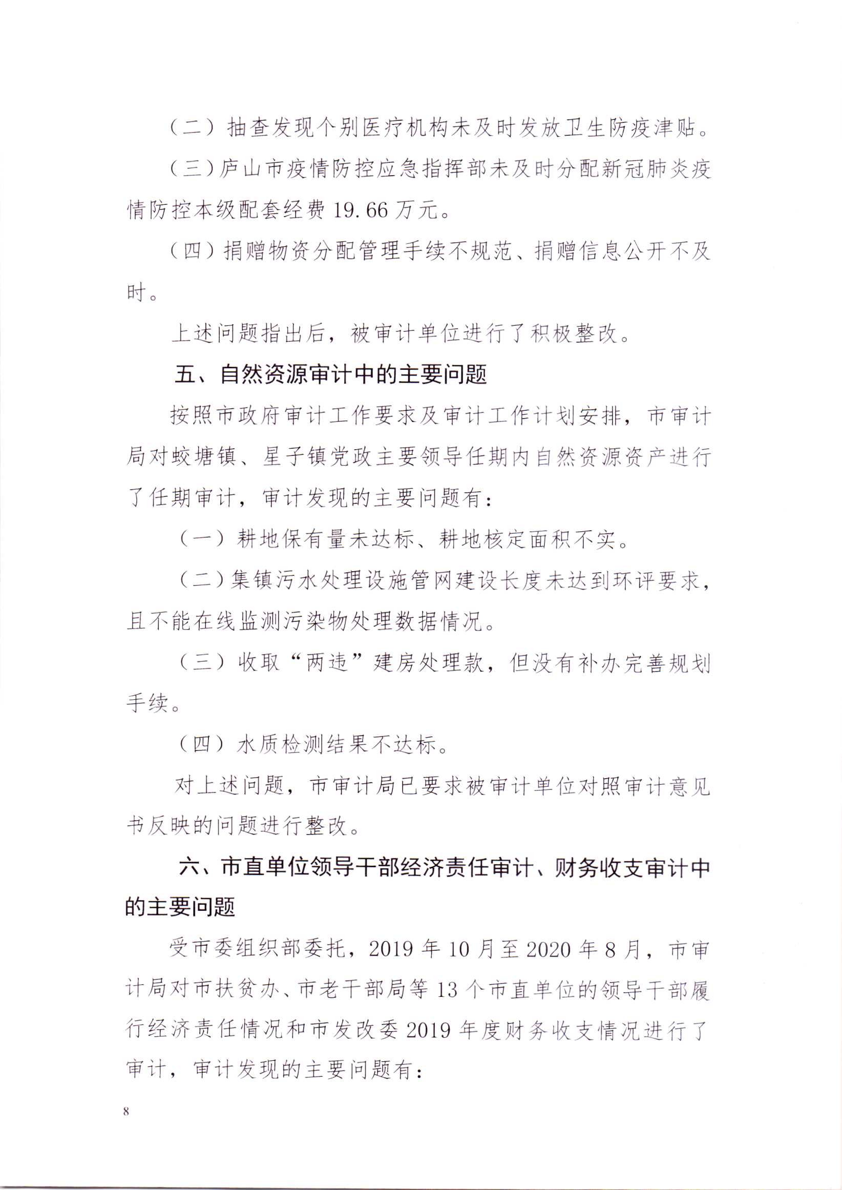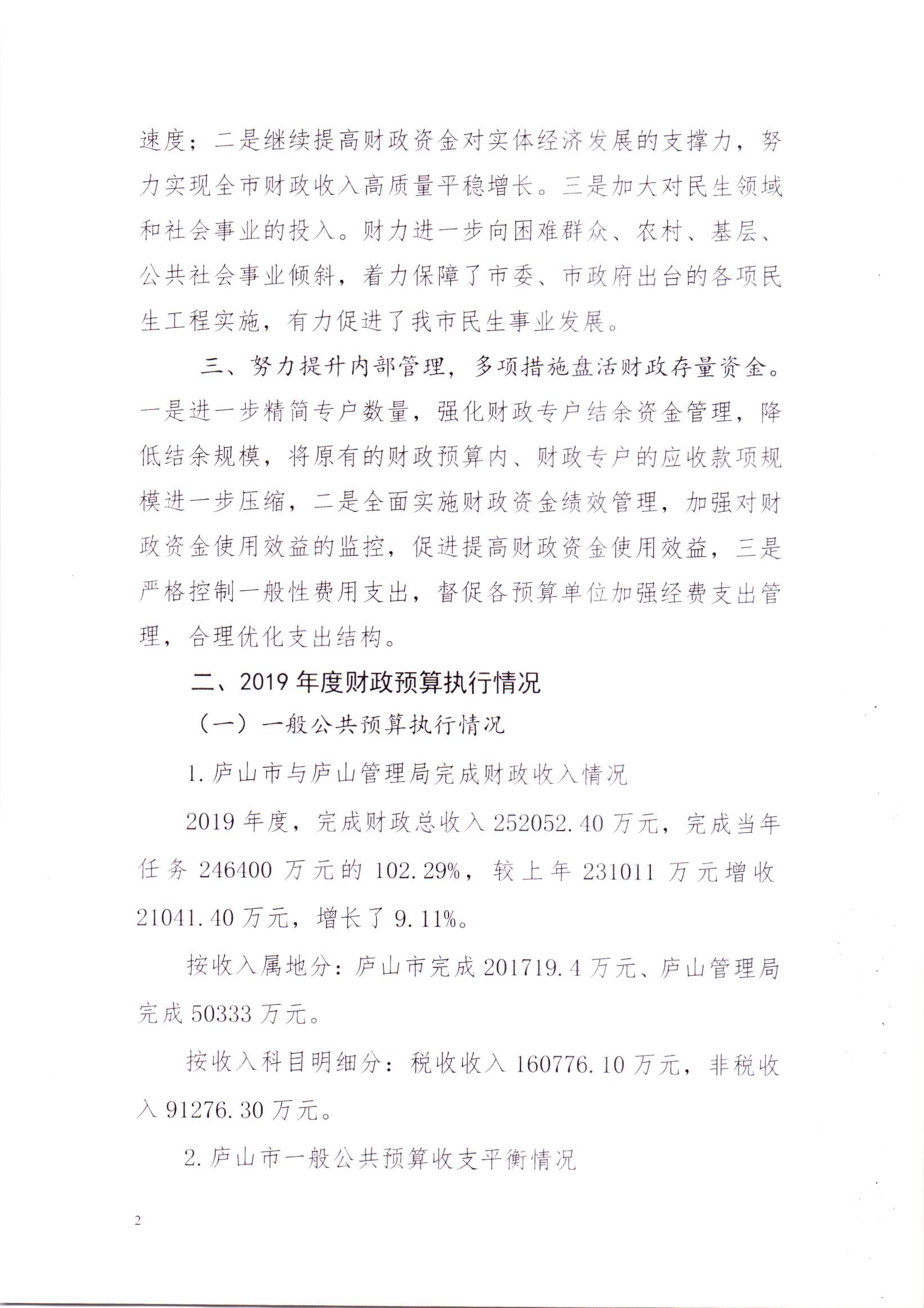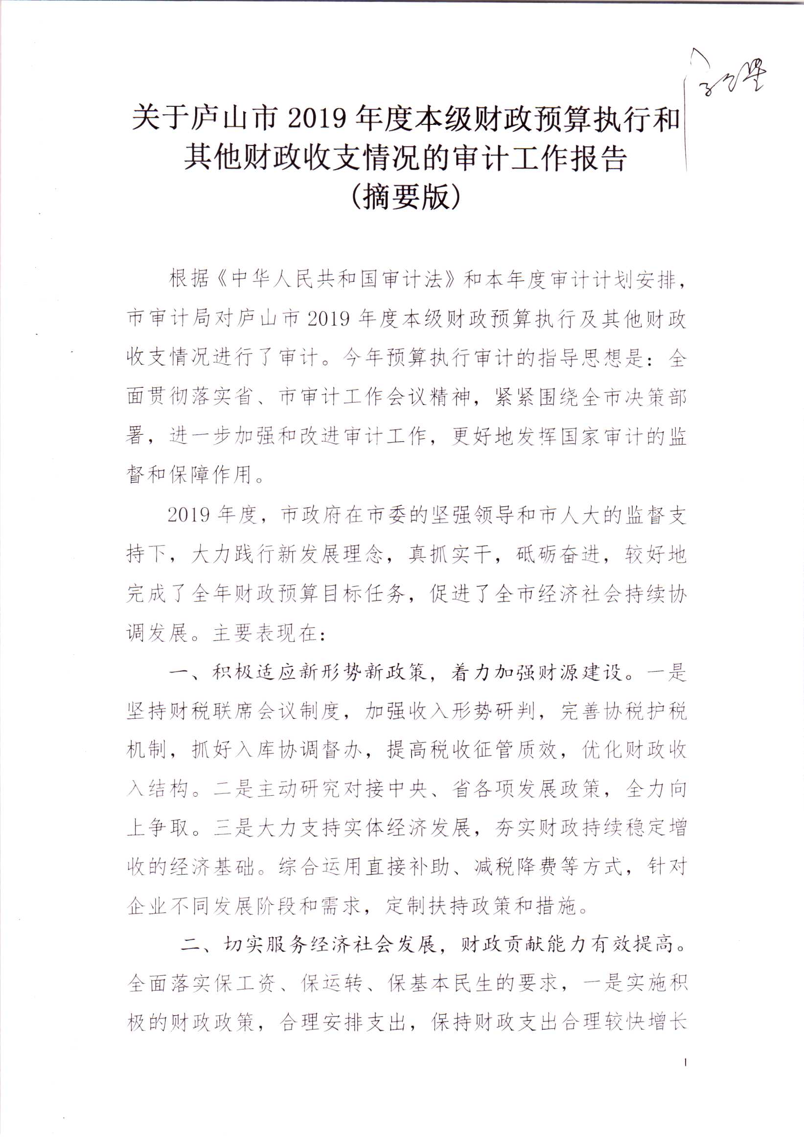 关于庐山市2019年本级预算执行及其他财政收支的审计工作报告(摘要稿)
