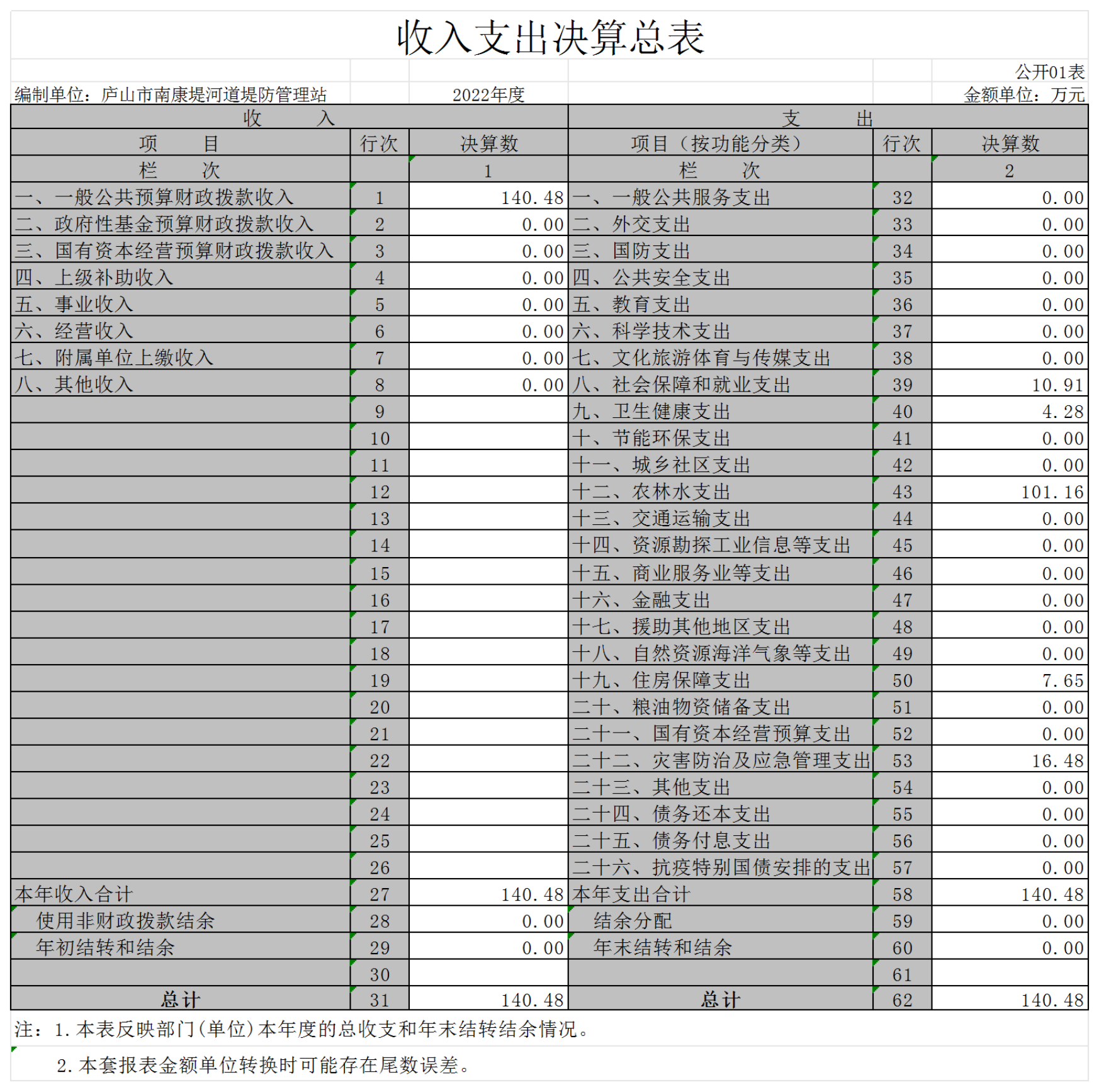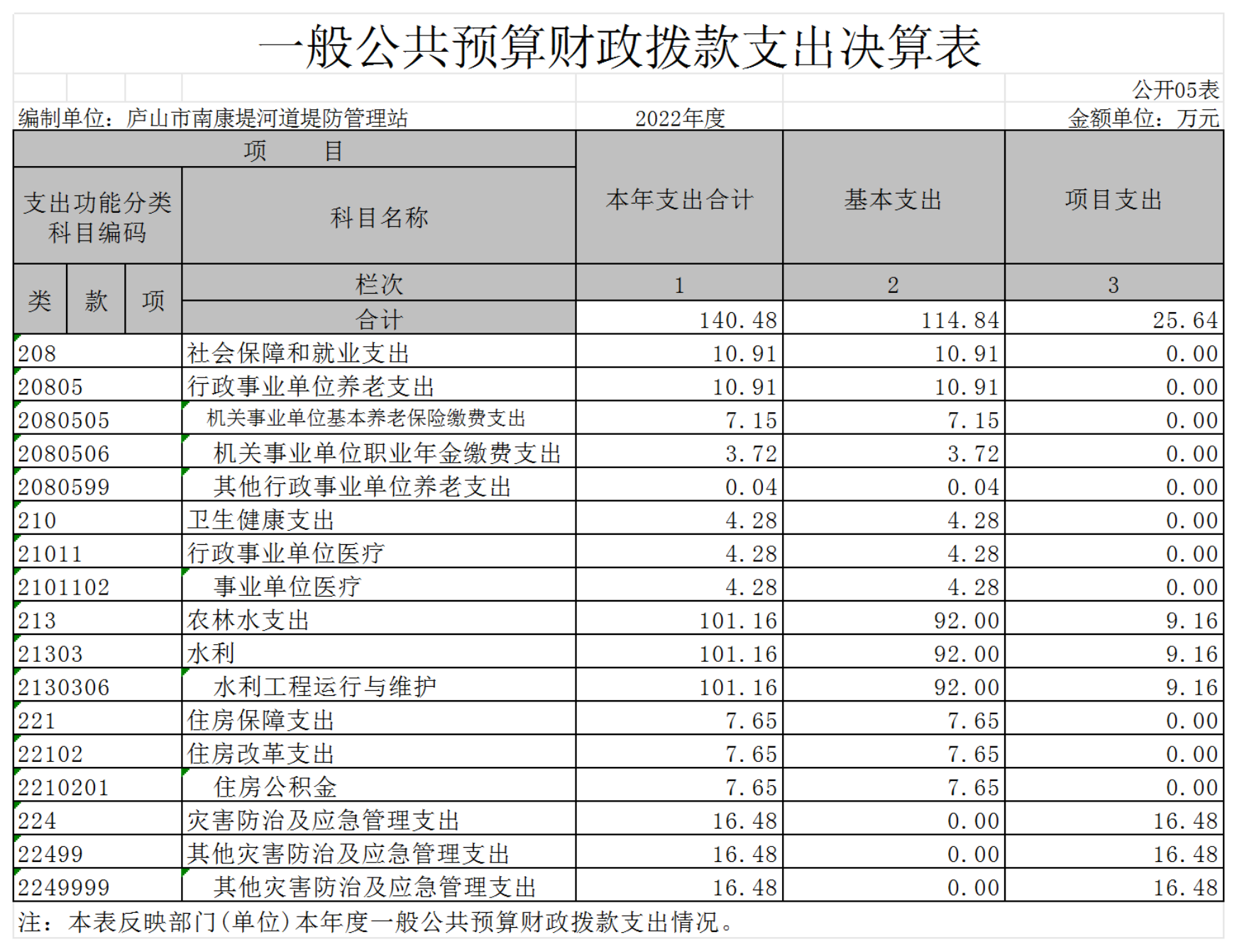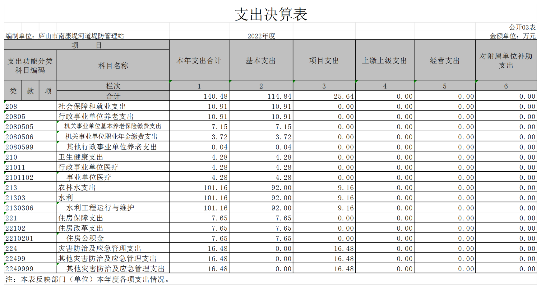 本单位2022年度支出总计140.48万元,其中本年支出合计140.48万元,较2021年减少9.78万元,下降6.5%,主要原因是:水利设施维修养护费用降低;年末结转和结余0万元,较2021年增加(减少)0万元,增长(下降)0%,主要原因是:结转结余款项全部由财政收回。