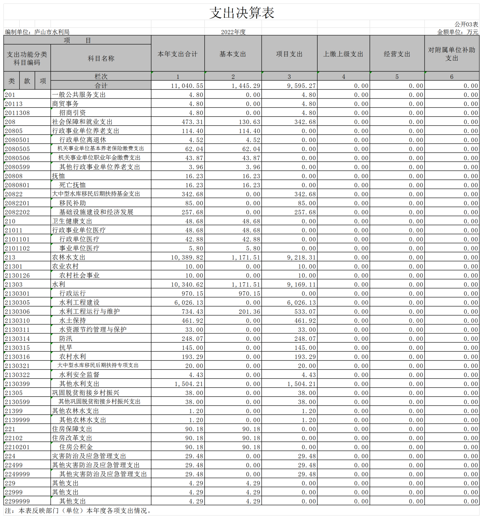 本部门2022年度支出总计11040.55万元,其中本年支出合计11040.55万元,较2021年增加647.49万元,增长6.47%,主要原因是:水利项目增加,支出增加;年末结转和结余0万元,较2021年减少0万元,下降100%,主要原因是:政府收回结余资金。