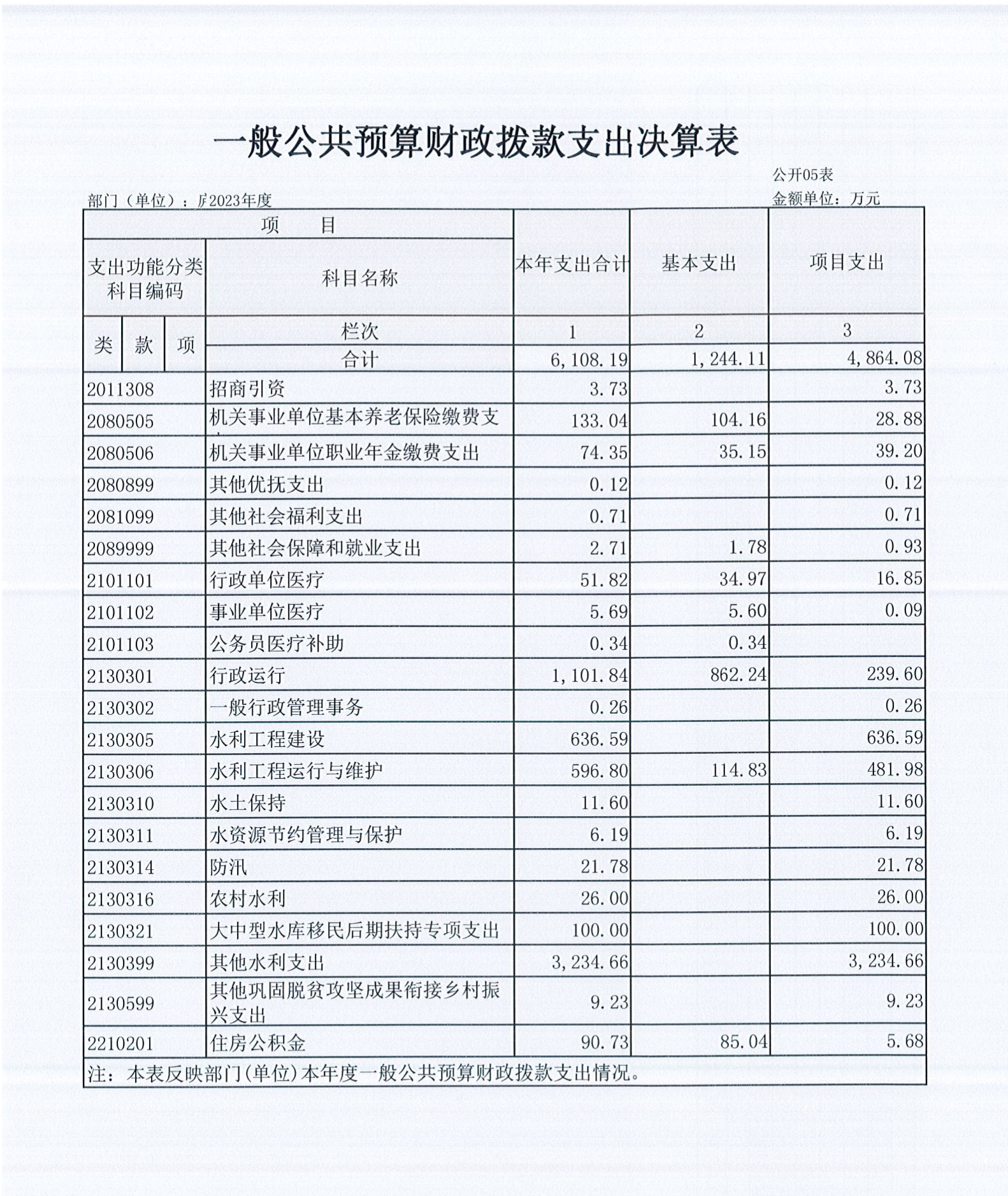 2023年部门绩效项目目标:总体用于水利局日常运转支出,包括人员基本工资、津贴补贴、医保及办公费、水电费、差旅费等日常公用经费支出及项目支出。