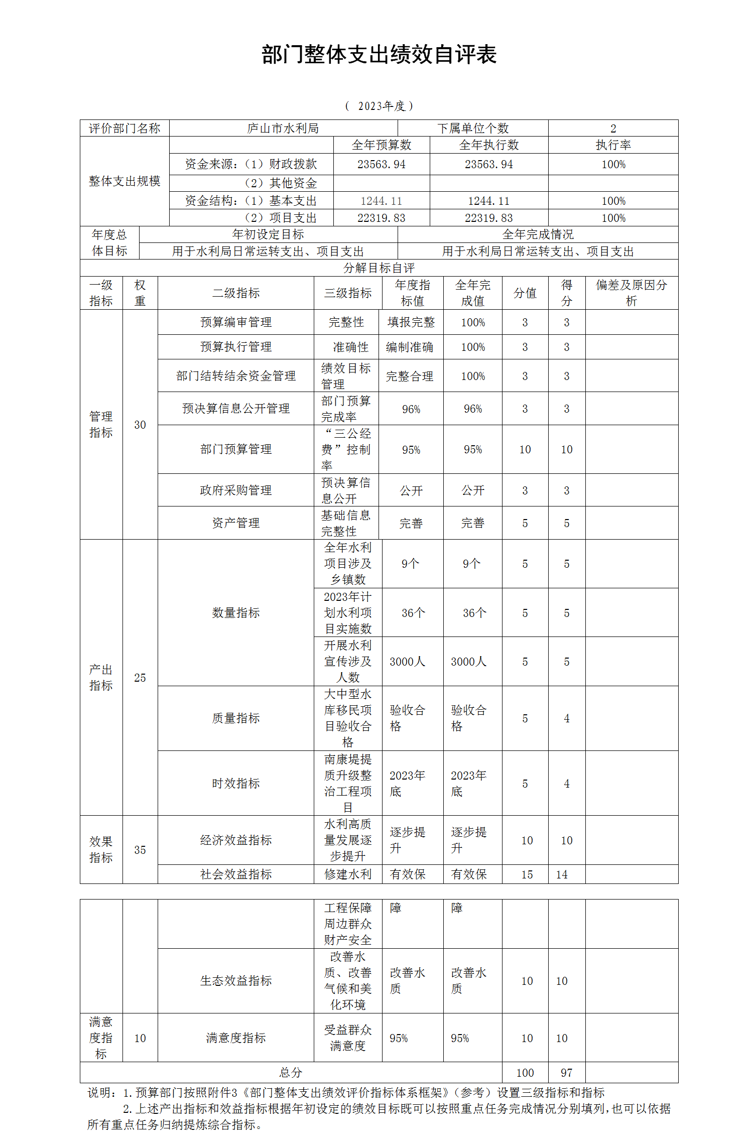 庐山市水利局“2023年部门整体支出绩效自评表”如下: