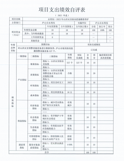 庐山市水利局“2023年山洪灾害防治措施维修养护支出绩效自评表”如下: