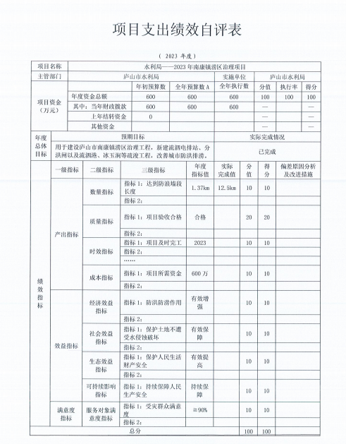 庐山市水利局“2023年南康镇涝区治理项目支出绩效自评表”如下: