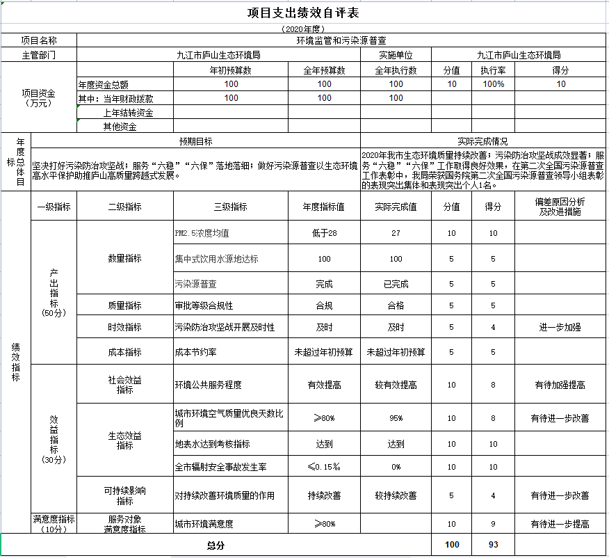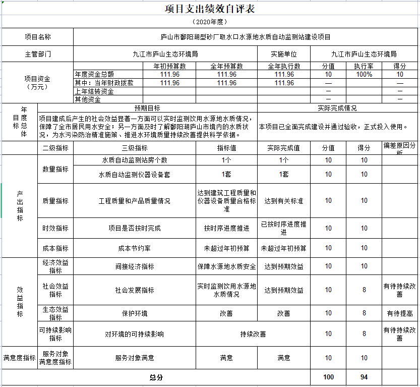 我局根据规定的开支范围支出项目经费,211.96万元项目支出包括环境监管和污染源普查项目预算100万元,决算数100万元;庐山市鄱阳湖型砂厂取水口水源地水质自动监测站建设项目预算数111.96万元,决算数111.96万元。保障了履行生态环境保护职能所需经费,推进了环境监管重点任务、重点工作的实施,取得了良好的社会效益和生态效益。绩效自评平均分为93.5分。其中:环境监管和污染源普查绩效自评93分;庐山市鄱阳湖型砂厂取水口水源地水质自动监测站建设项目94分。