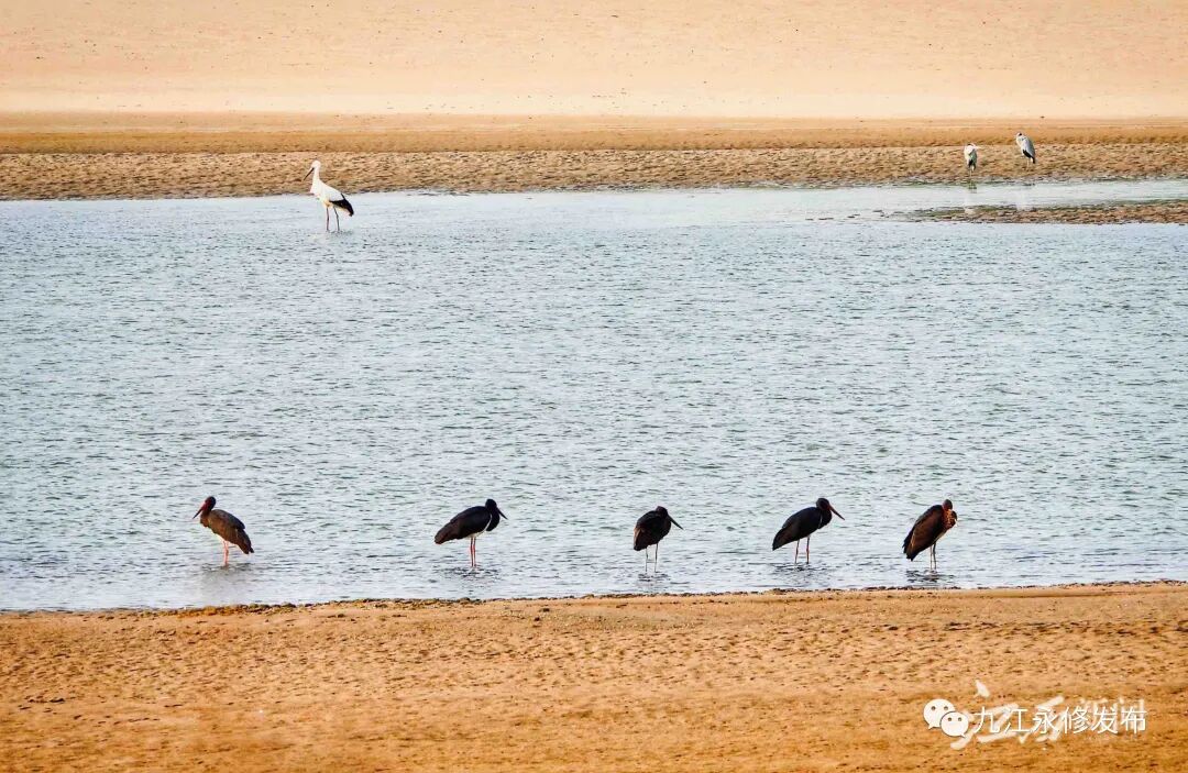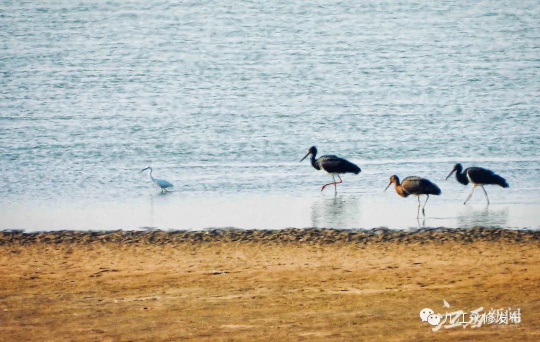 11月18日,鄱阳湖畔永修县三角乡水域,几只黑鹳漫步在浅水滩涂上,还与东方白鹳罕见同框,一起觅食。
