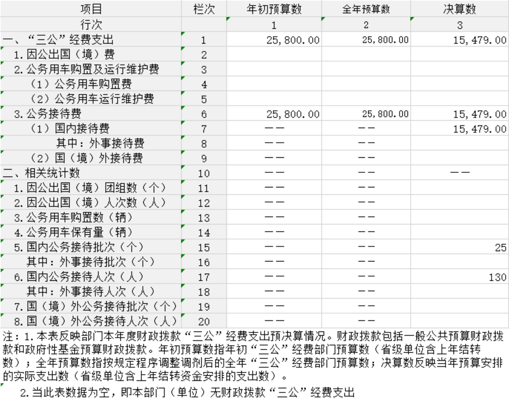 (一)“三公”经费:是指用财政拨款安排的因公出国(境)费、公务用车购置及运行维护费和公务接待费。其中,因公出国(境)费反映单位公务出国(境)的国际旅费、国外城市间交通费、住宿费、伙食费、培训费、公杂费等支出;公务用车购置及运行维护费反映单位公务用车车辆购置支出(含车辆购置税、牌照费),按规定保留的公务用车燃料费、维修费、过桥过路费、保险费、安全奖励费用等支出;公务接待费反映单位按规定开支的各类公务接待(含外宾接待)支出。