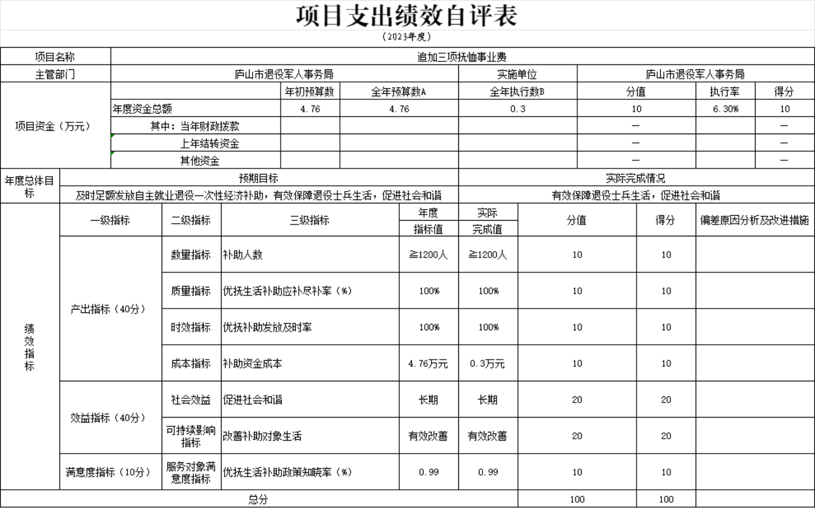本单位“追加三项抚恤事业费项目支出绩效自评表”如下: