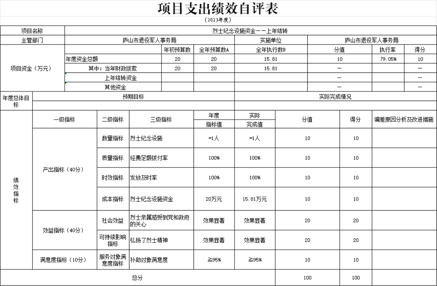 本单位“烈士纪念设施资金——上年结转项目支出绩效自评表”如下: