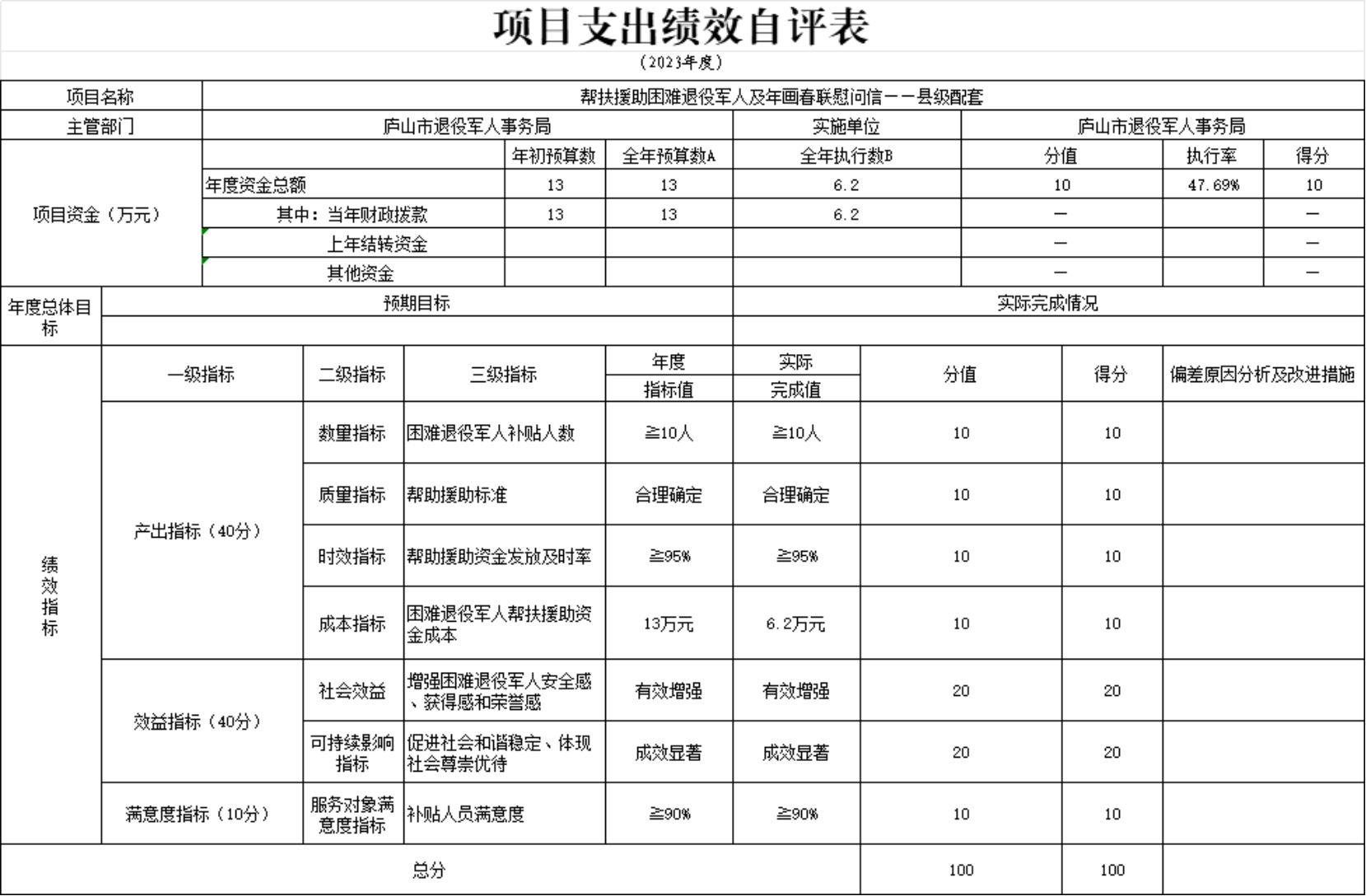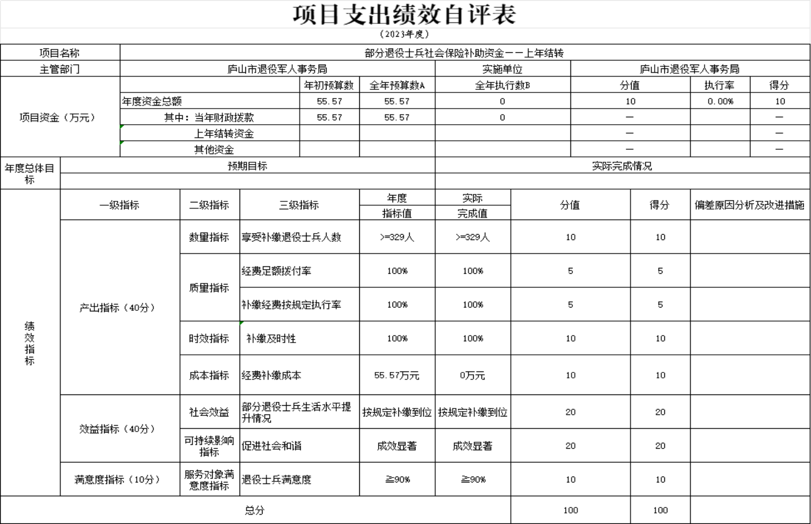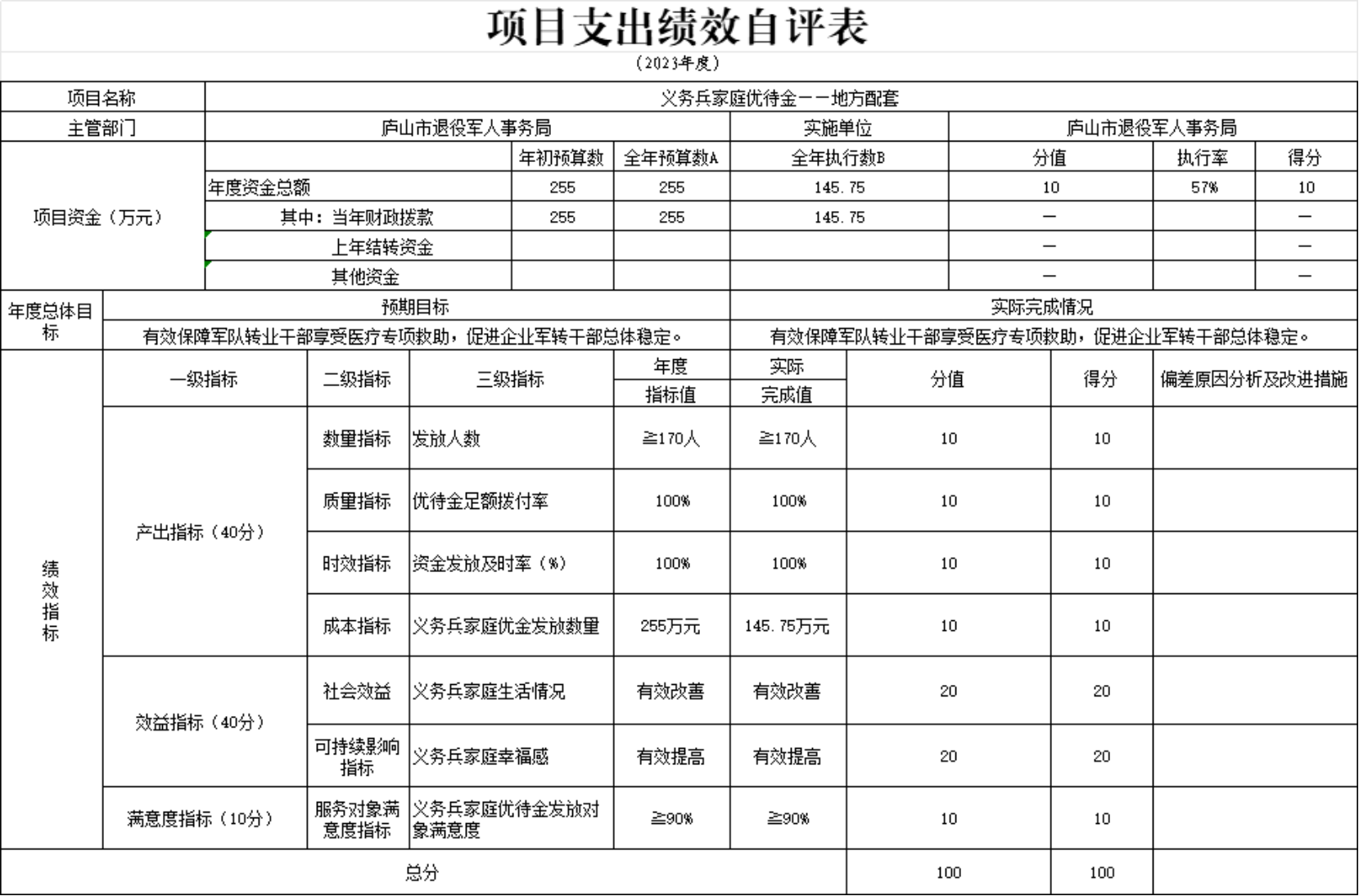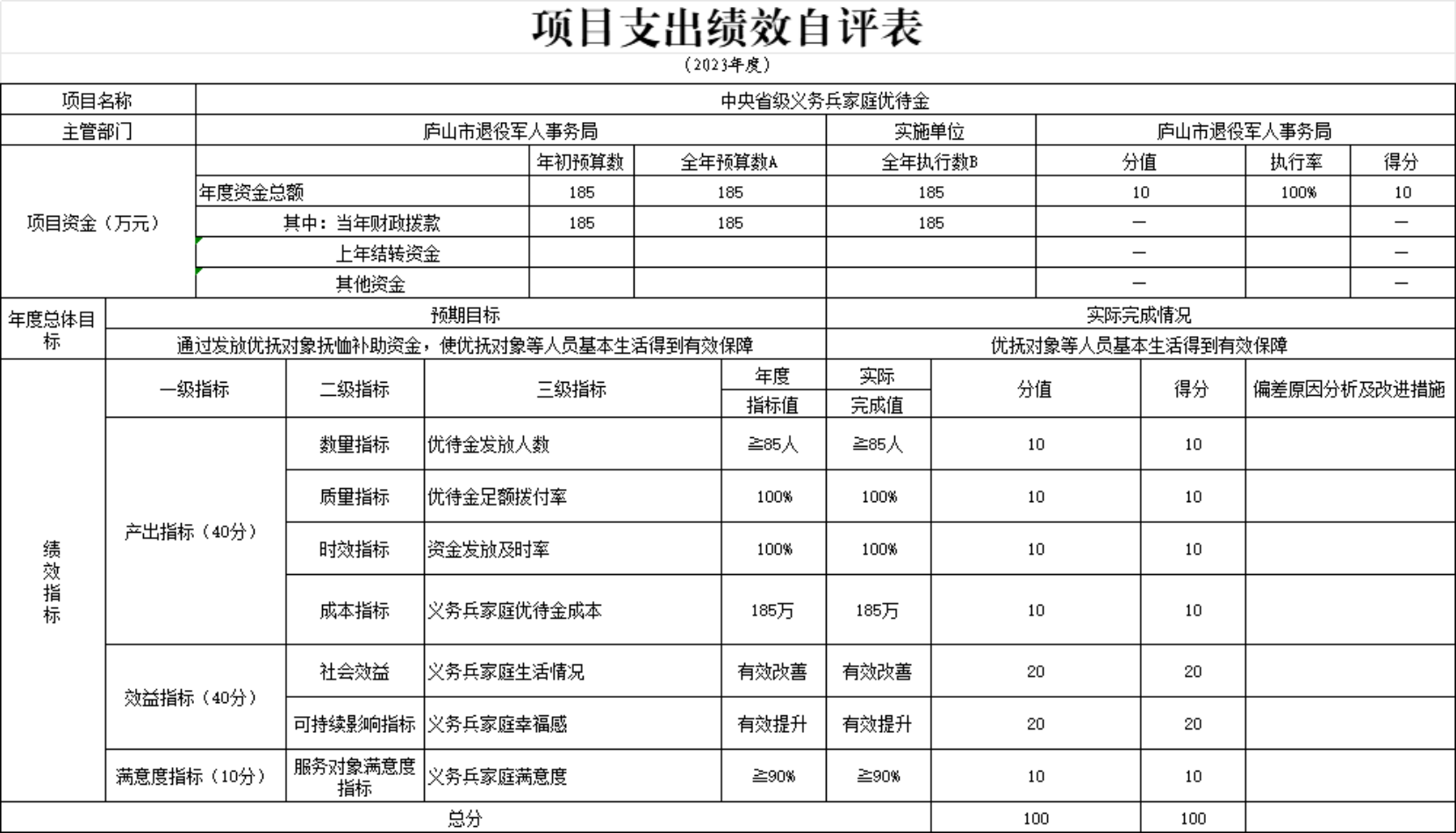 本单位优抚对象补助经费和义务兵家庭优待金项目支出绩效自评表”如下: