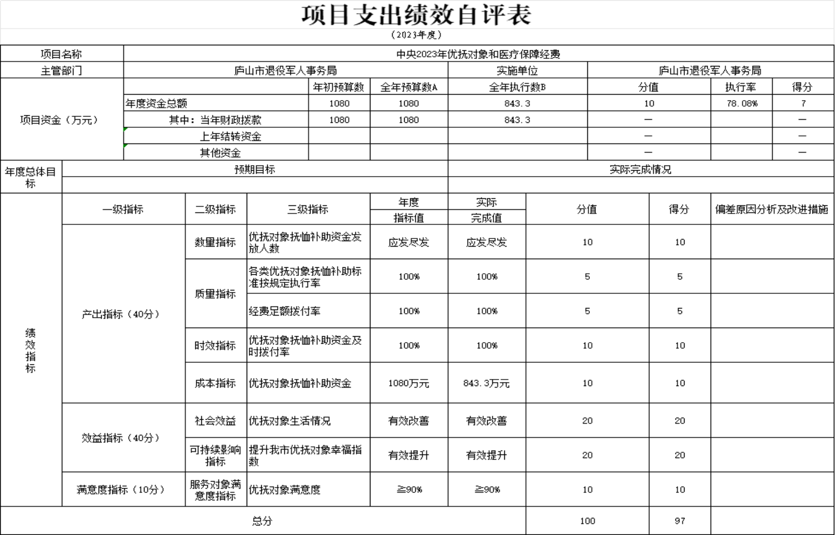 本单位中央2023年优抚对象和医疗保障经费项目支出绩效自评表”如下: